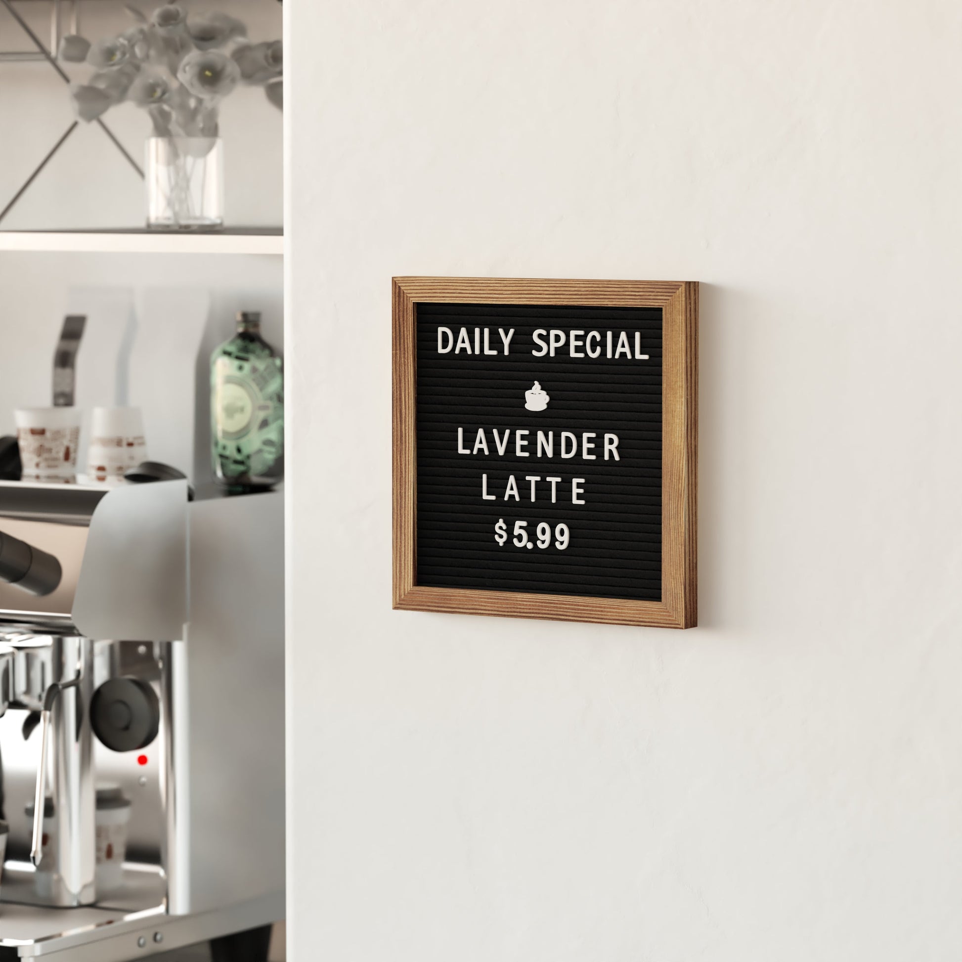 Gracie 10x10 Felt Letter Board with Wooden Frame, 389 PP Letters Including Numbers, Symbols and Icons, Canvas Carrying Case, Torched Wood/Black Felt Dimensions: 10"W x 1"D x 10"H