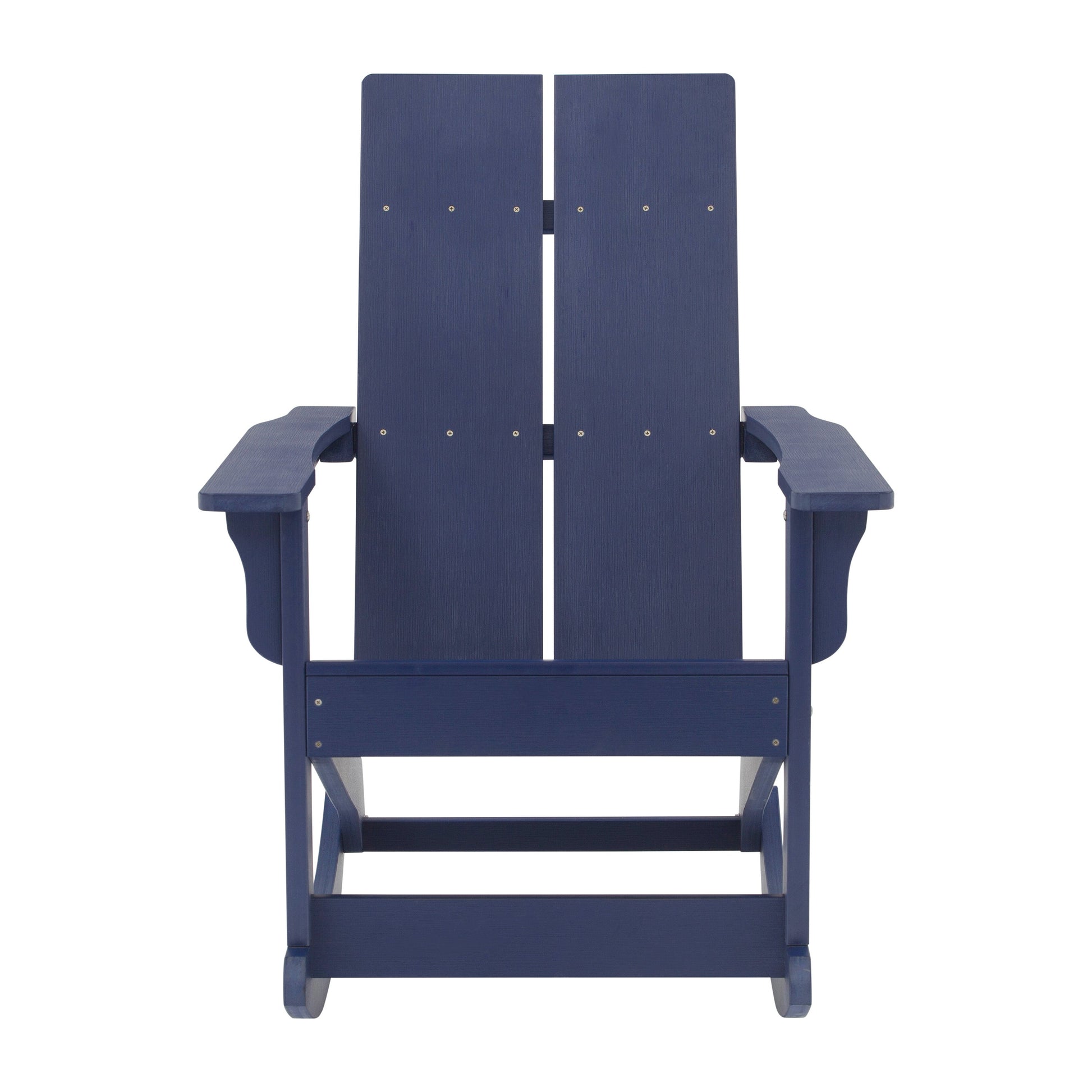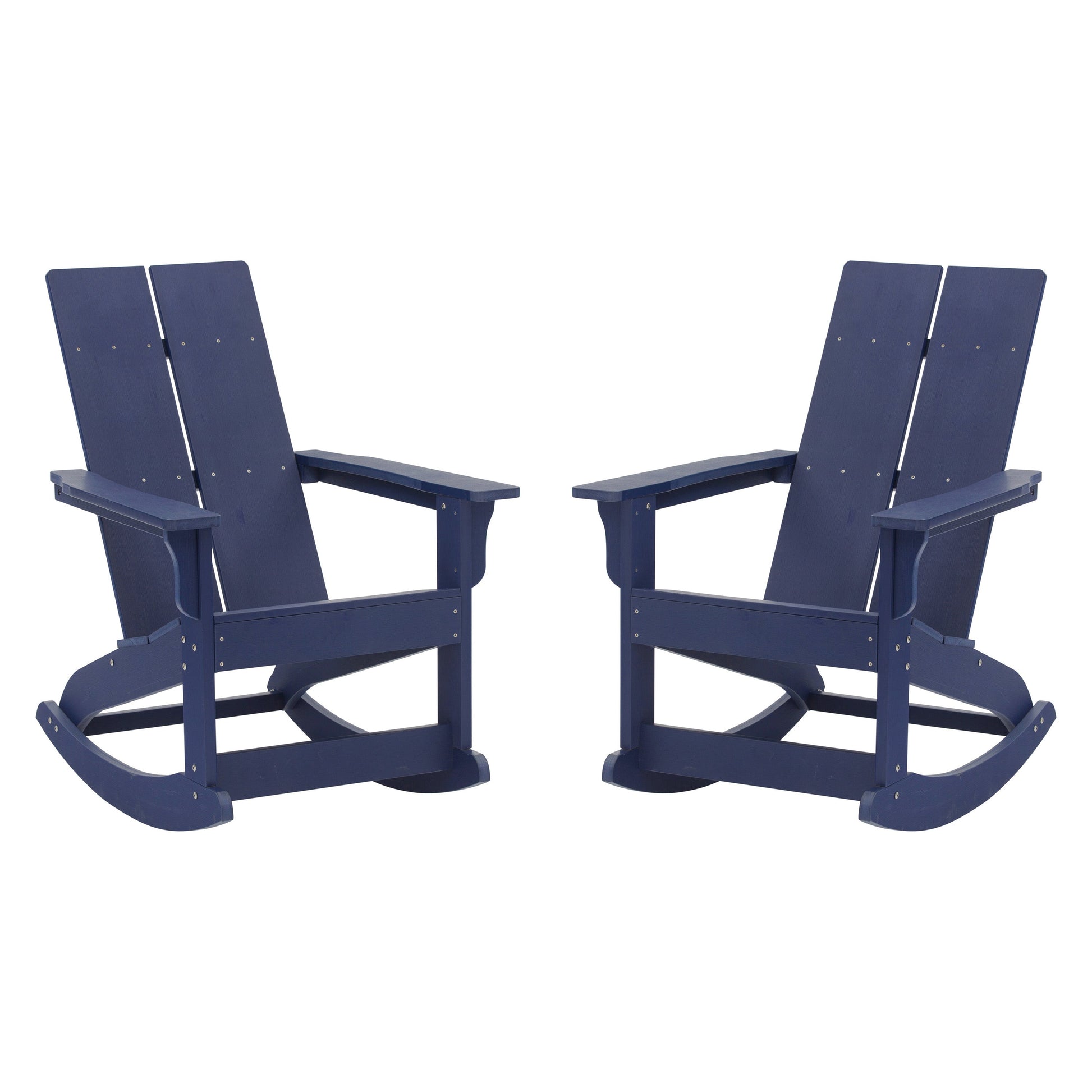 Finn Modern Commercial Grade All-Weather 2-Slat Poly Resin Rocking Adirondack Chair with Rust Resistant Stainless Steel Hardware in Navy - Set of2 Dimensions: 29"W x 38"D x 40.5"H