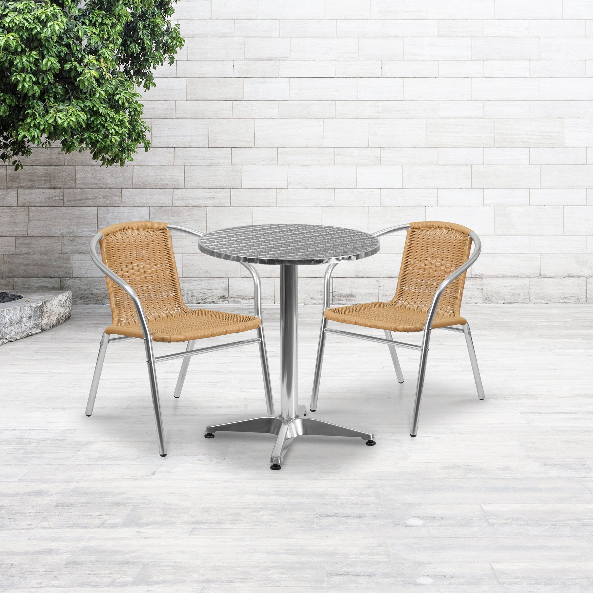 Lila 23.5'' Round Aluminum Indoor-Outdoor Table Set with 2 Beige Rattan Chairs Dimensions: 23.5"W x 23.5"D x 27.5"H