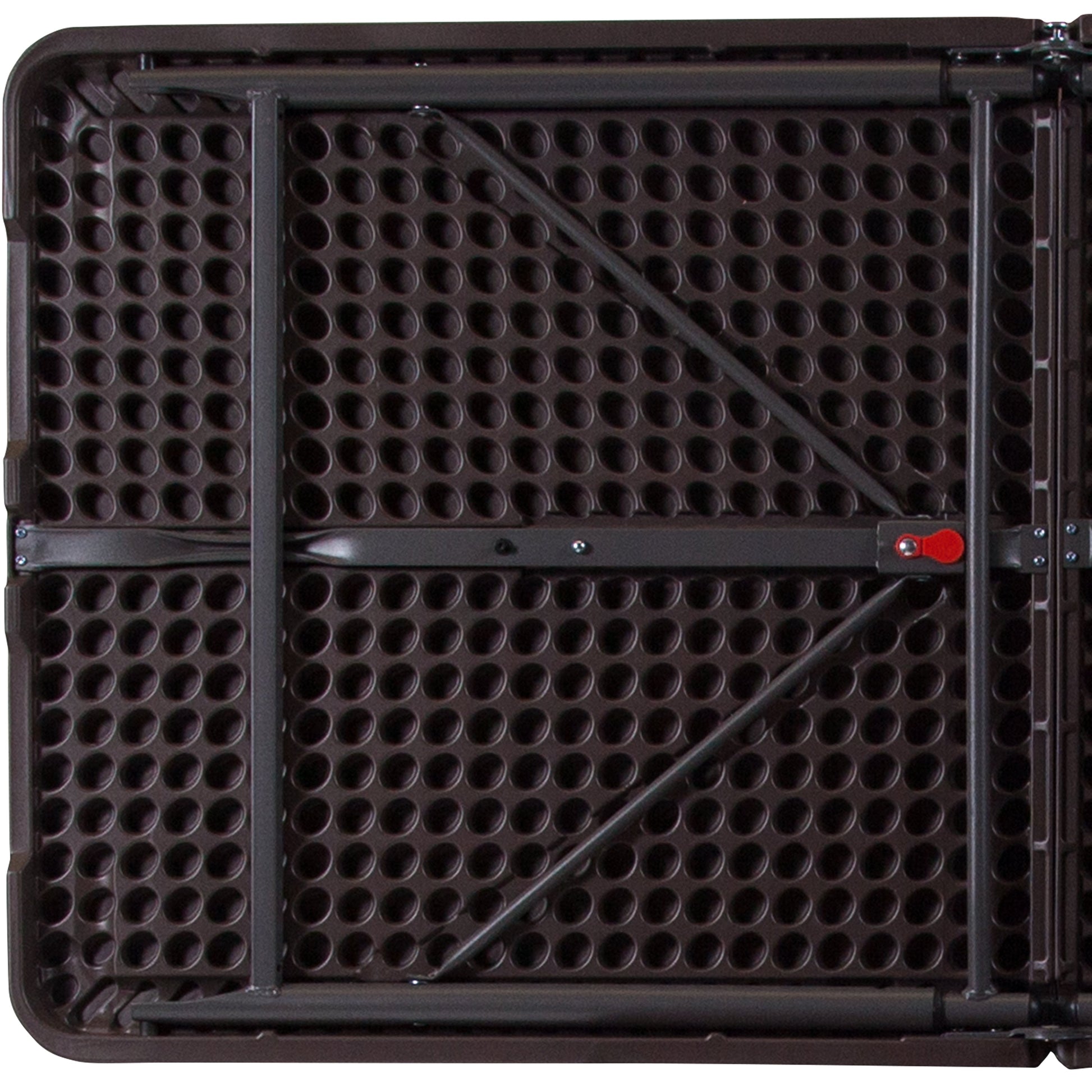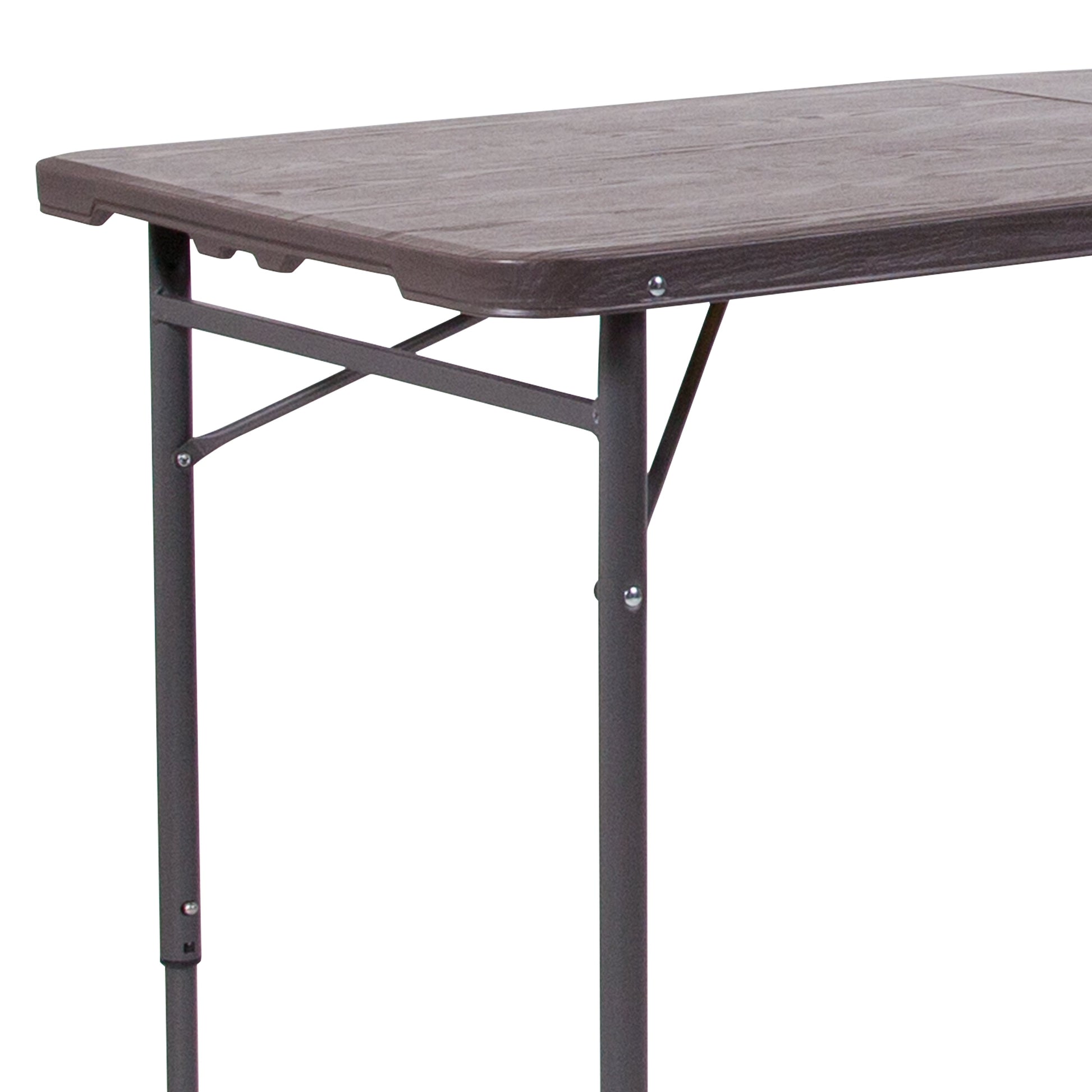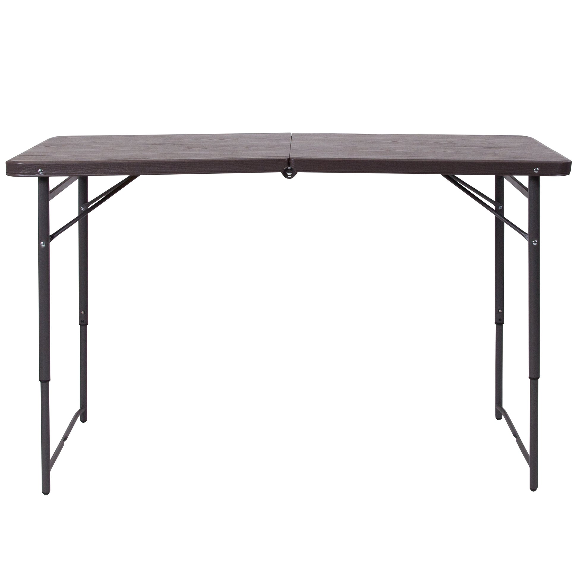Mills 4-Foot Height Adjustable Bi-Fold Brown Wood Grain Plastic Folding Table with Carrying Handle Dimensions: 23.5"W x 48.25"D x 21.5" - 29.5"H