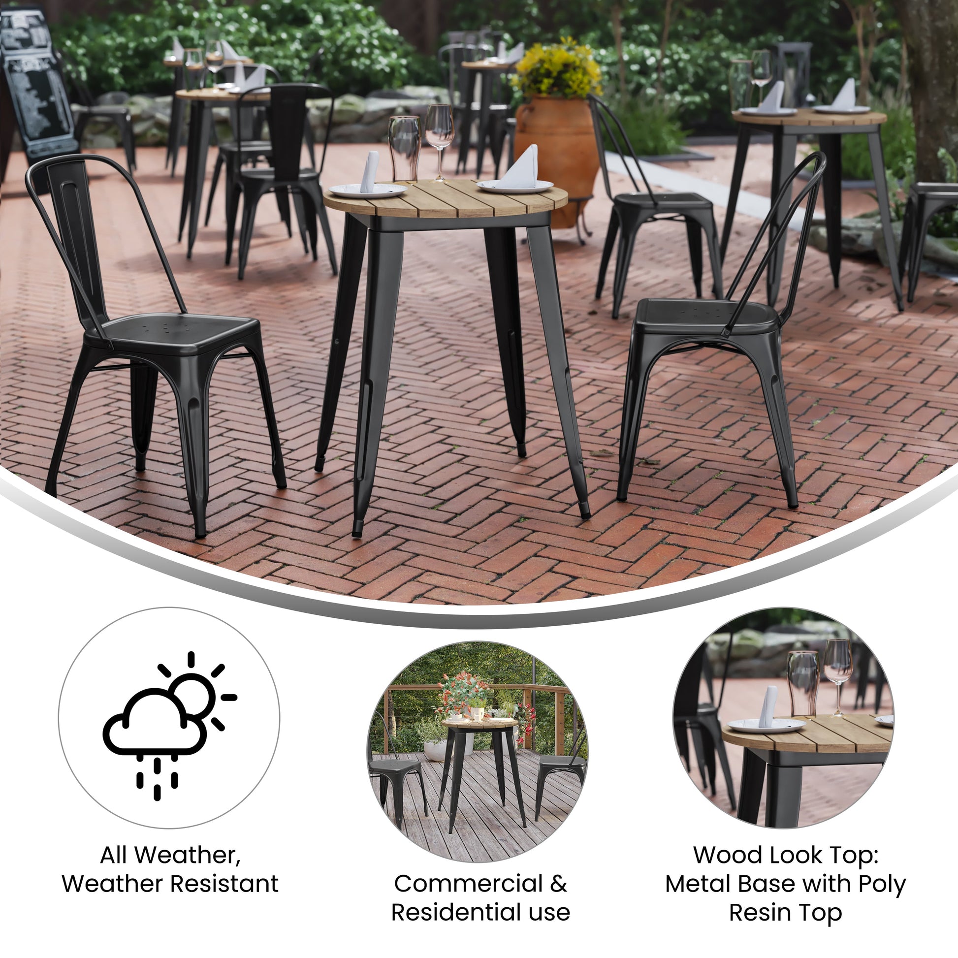 Declan Commercial Grade Indoor/Outdoor Dining Table, 23.75" Round All Weather Brown Poly Resin Top with Black Steel Base Dimensions: 23.75"W x 23.75"D x 30"H