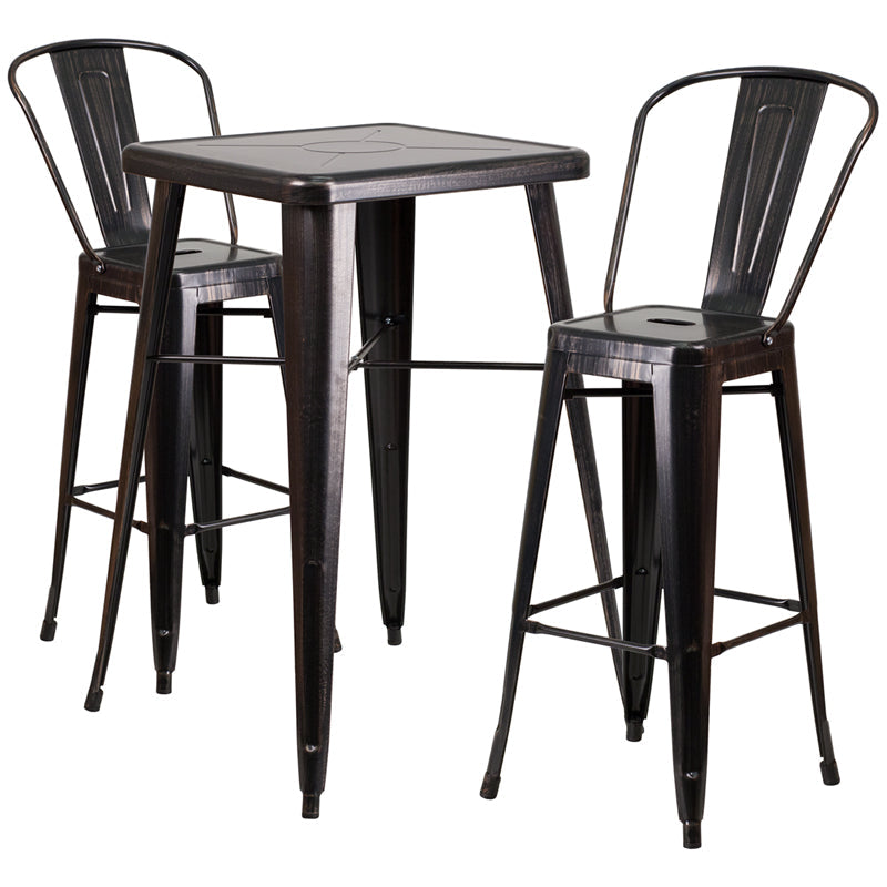 Gable Commercial Grade 23.75" Square Black-Antique Gold Metal Indoor-Outdoor Bar Table Set with 2 Stools with Backs Dimensions: 27.75"W x 27.75"D x 40"H