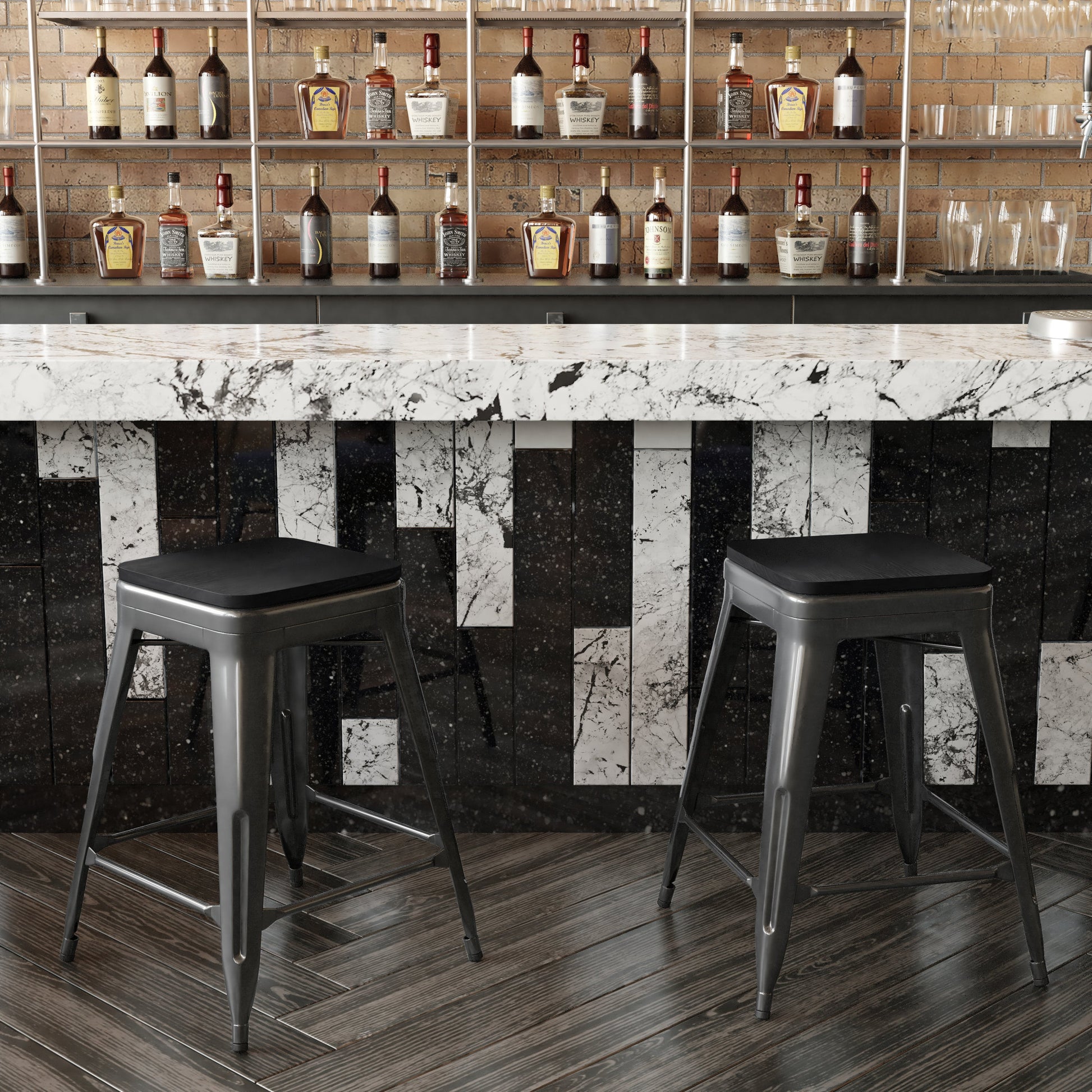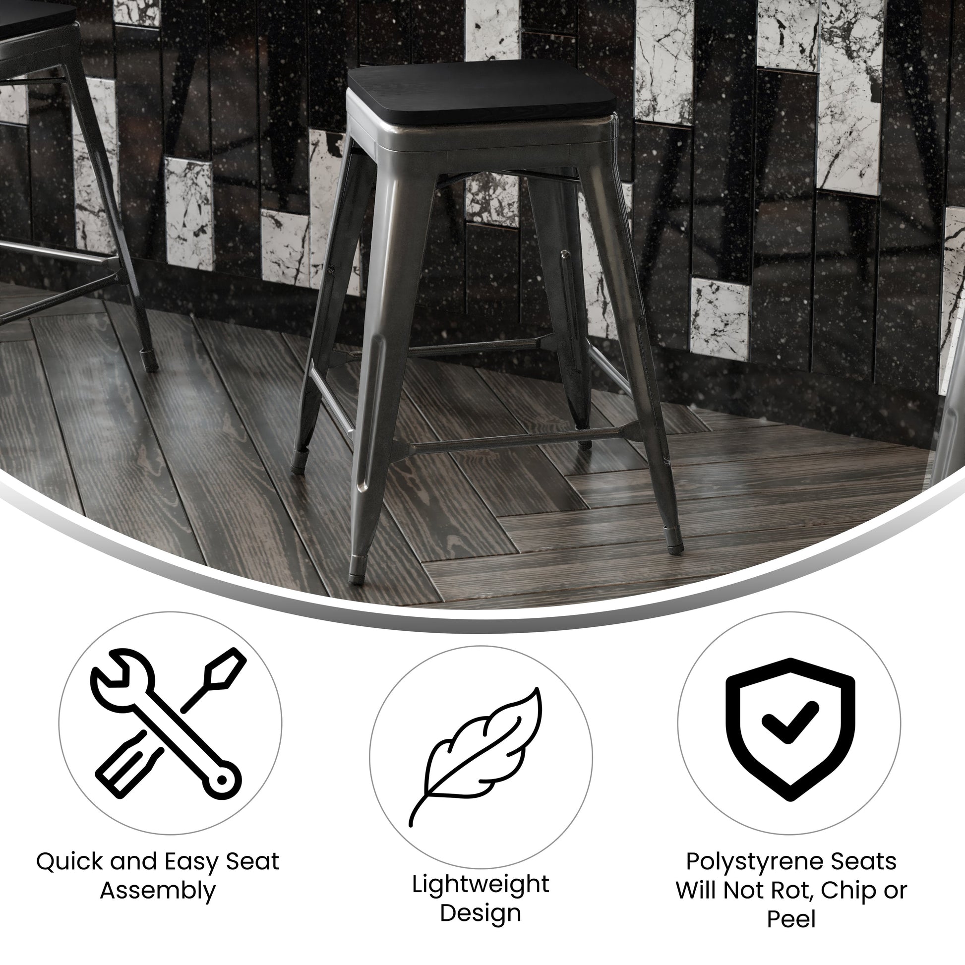 Kai Commercial Grade 24" High Backless Black Metal Indoor-Outdoor Counter Height Stool with Black Poly Resin Wood Seat Dimensions: 16"W x 16"D x 24.75"H