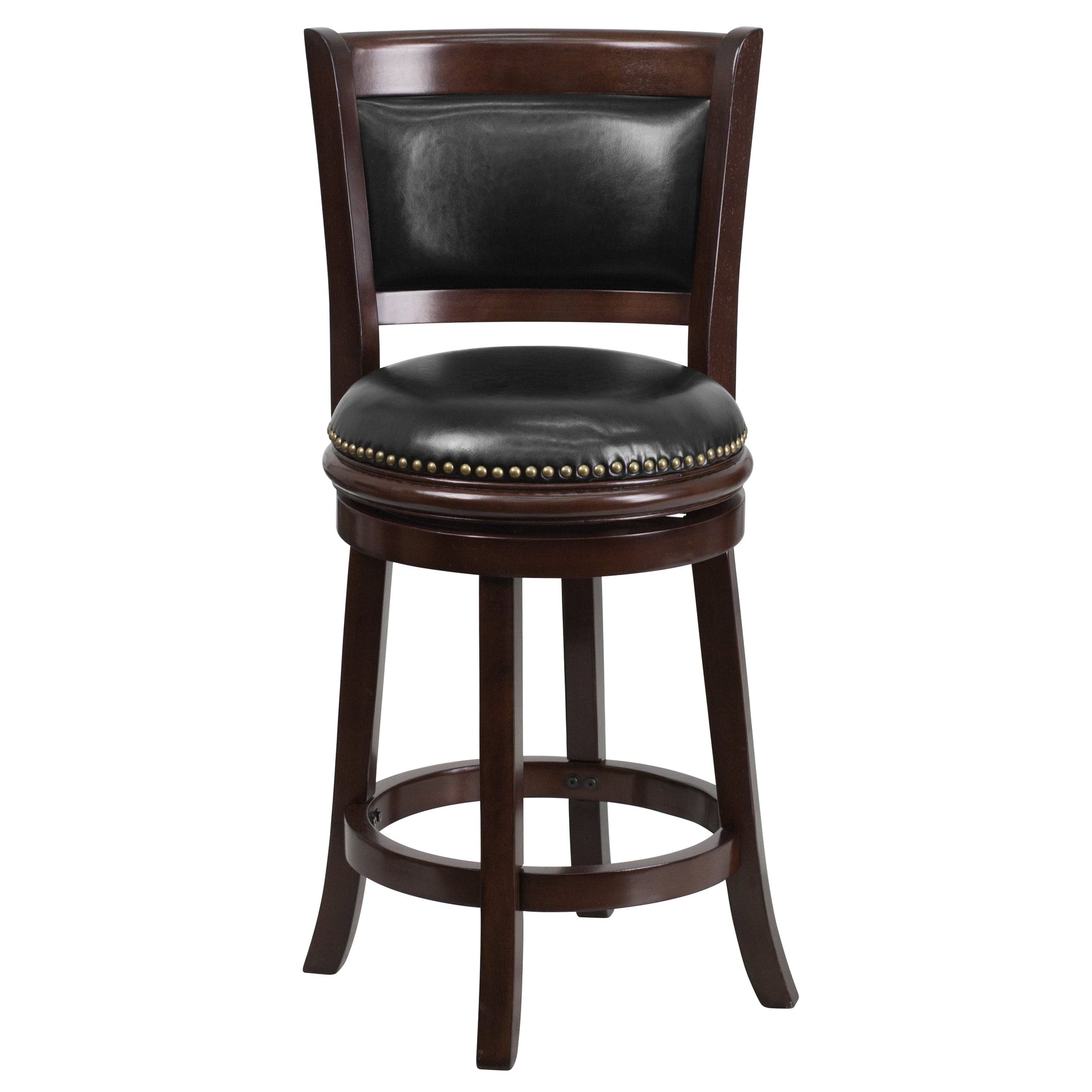 Mark 24'' High Cappuccino Wood Counter Height Stool with Panel Back and Black LeatherSoft Swivel Seat Dimensions: 20"W x 19"D x 38"H