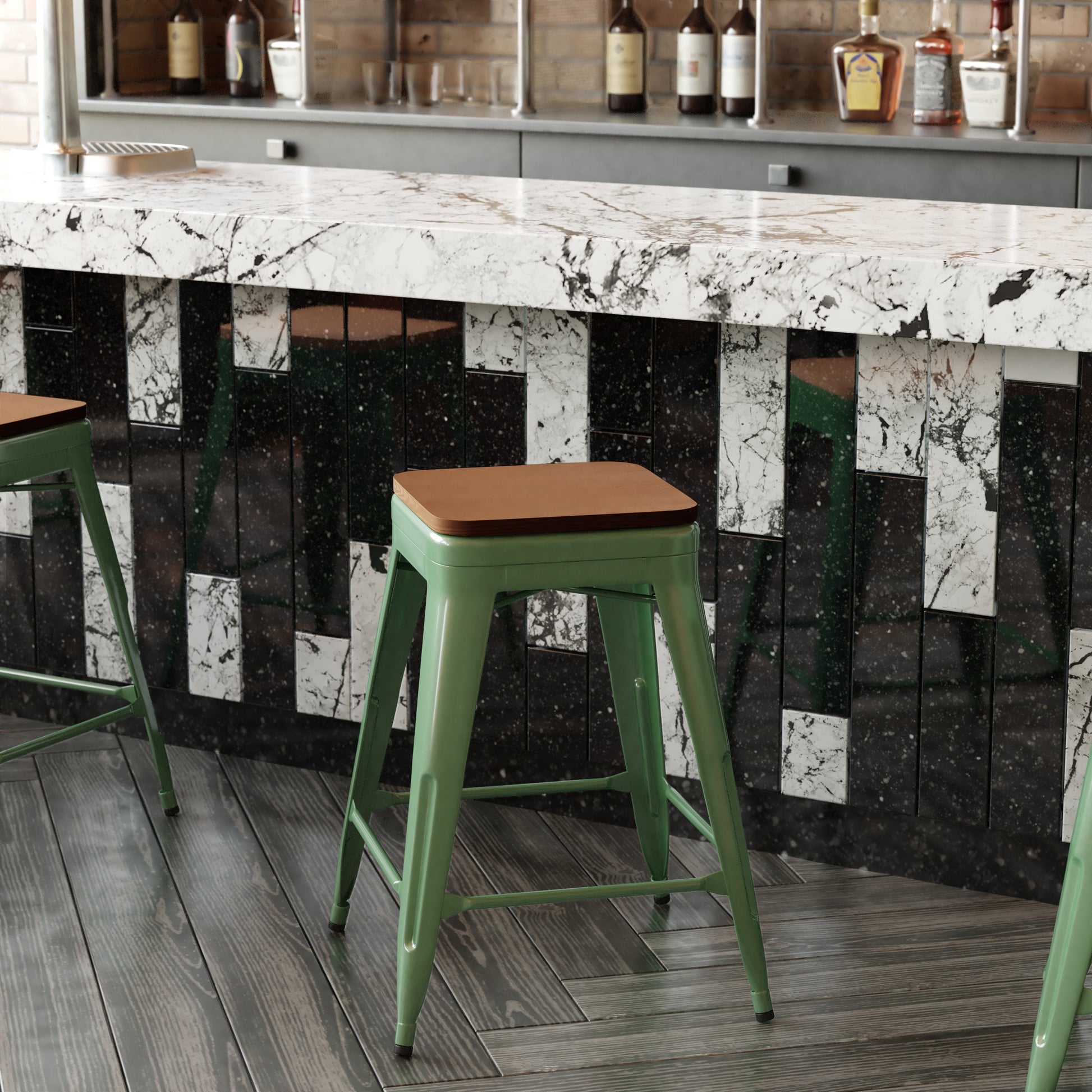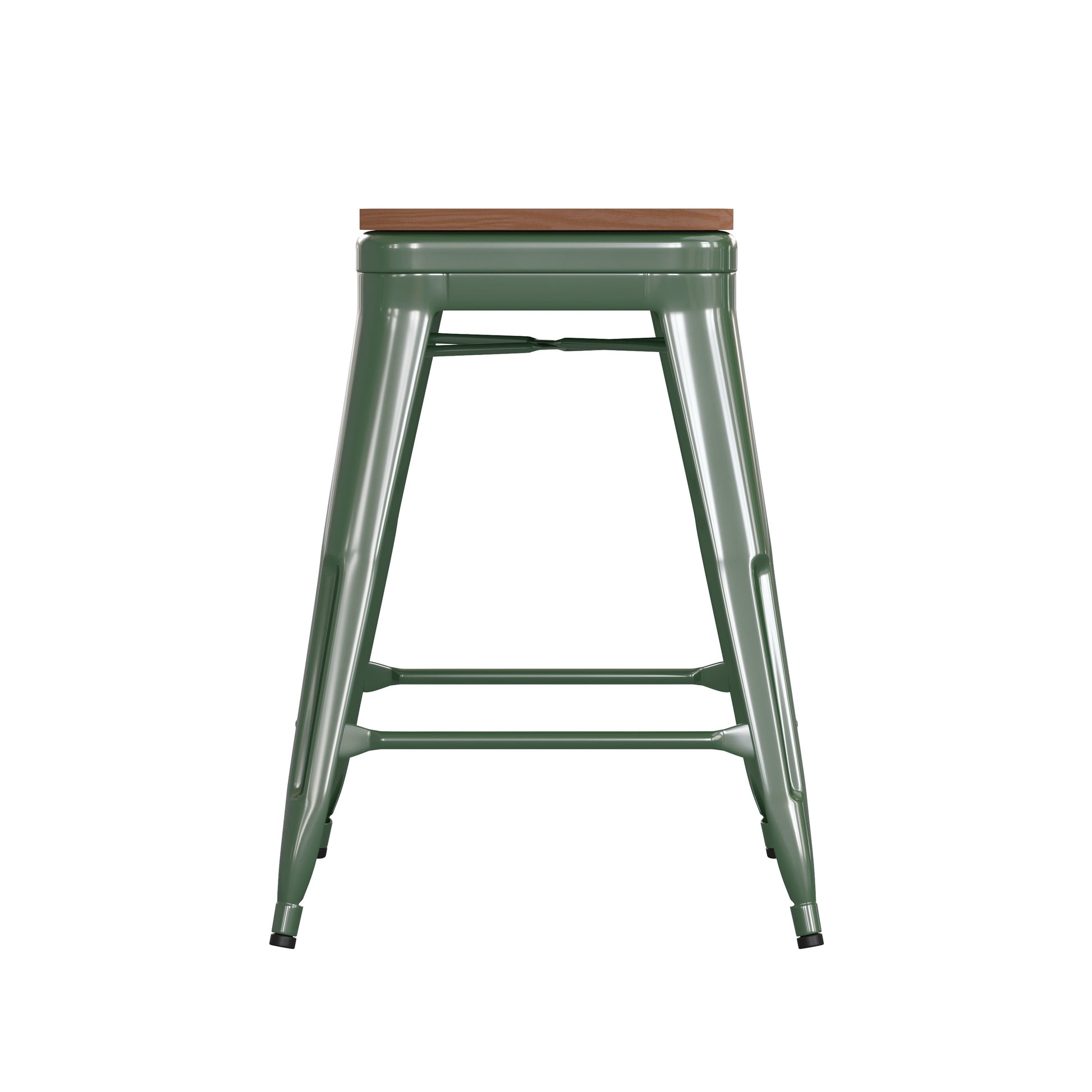 Kai Commercial Grade 24" High Backless Green Metal Indoor-Outdoor Counter Height Stool with Teak Poly Resin Wood Seat Dimensions: 16"W x 16"D x 24.75"H