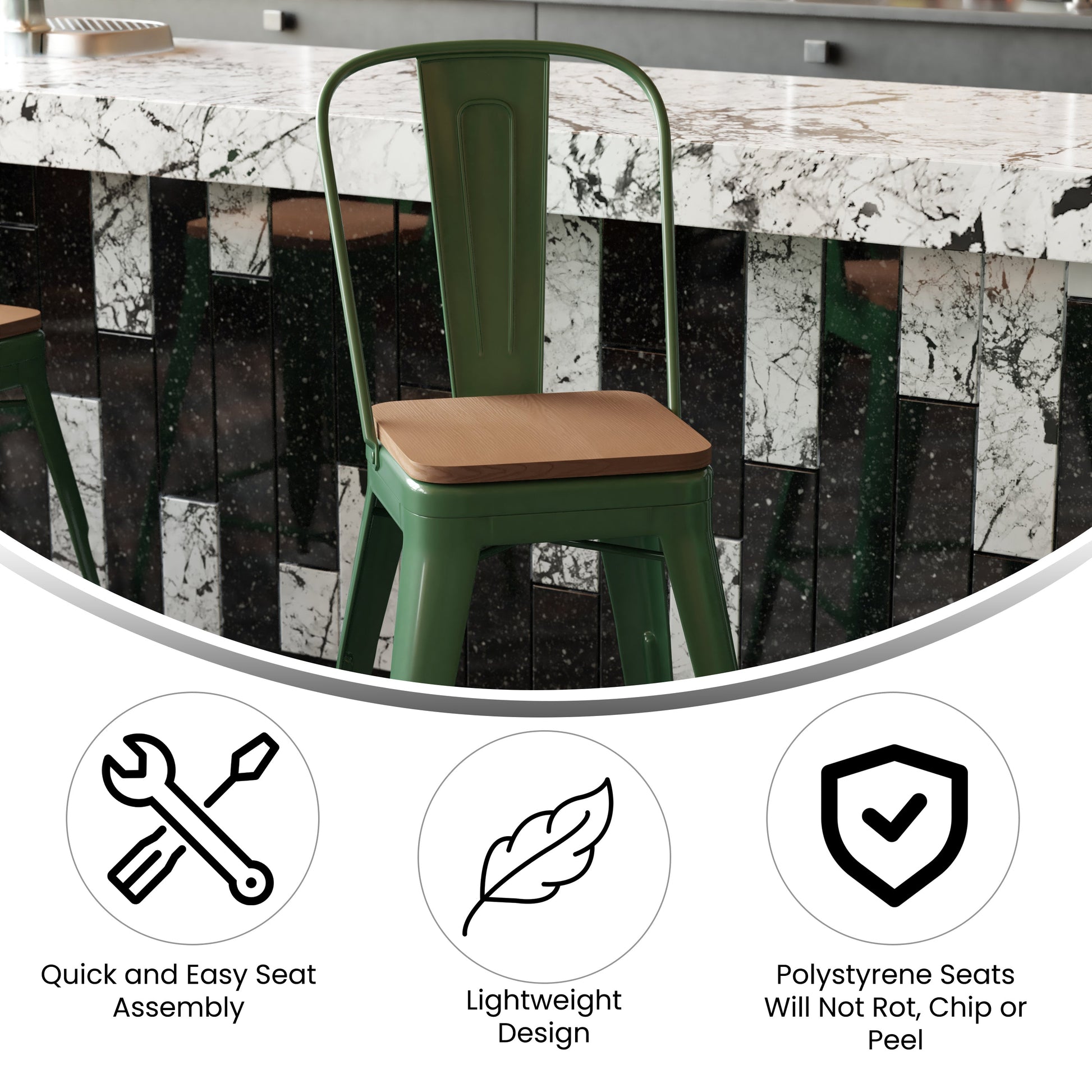 Kai Commercial Grade 24" High Green Metal Indoor-Outdoor Counter Height Stool with Removable Back and Teak All-Weather Poly Resin Seat Dimensions: 17.75"W x 20"D x 39.25"H