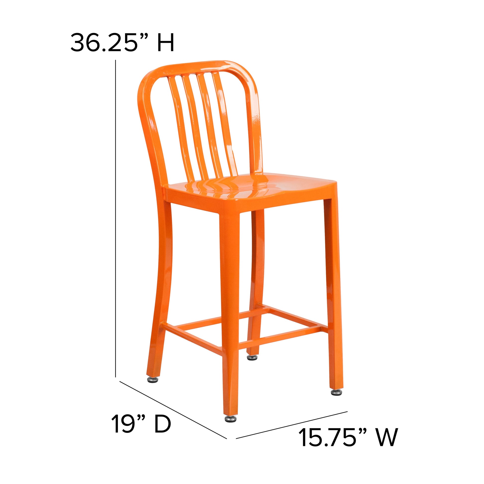 Gael Commercial Grade 24" High Orange Metal Indoor-Outdoor Counter Height Stool with Vertical Slat Back Dimensions: 15.75"W x 19"D x 36.25"H