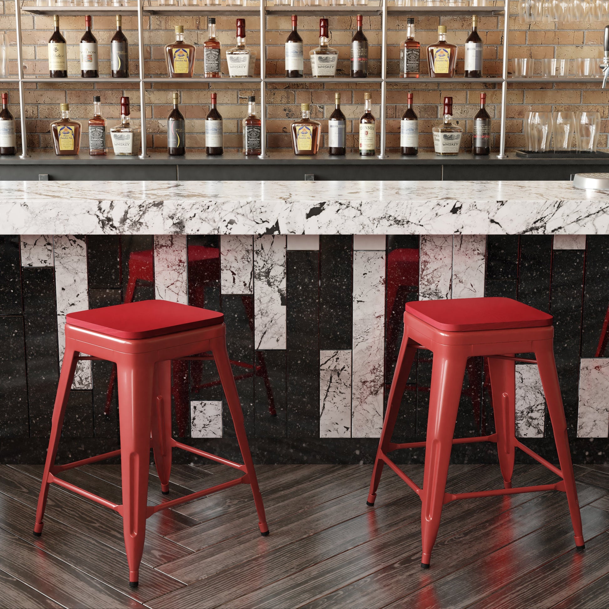 Kai Commercial Grade 24" High Backless Red Metal Indoor-Outdoor Counter Height Stool with Red Poly Resin Wood Seat Dimensions: 16"W x 16"D x 24.75"H