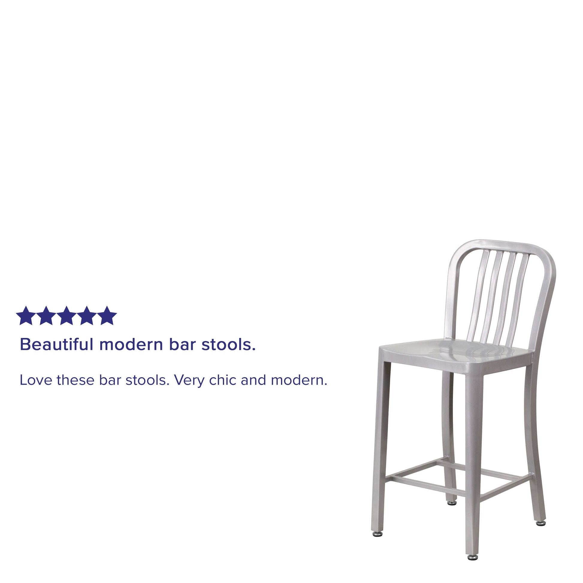 Gael Commercial Grade 24" High Silver Metal Indoor-Outdoor Counter Height Stool with Vertical Slat Back Dimensions: 15.75"W x 19"D x 36.25"H