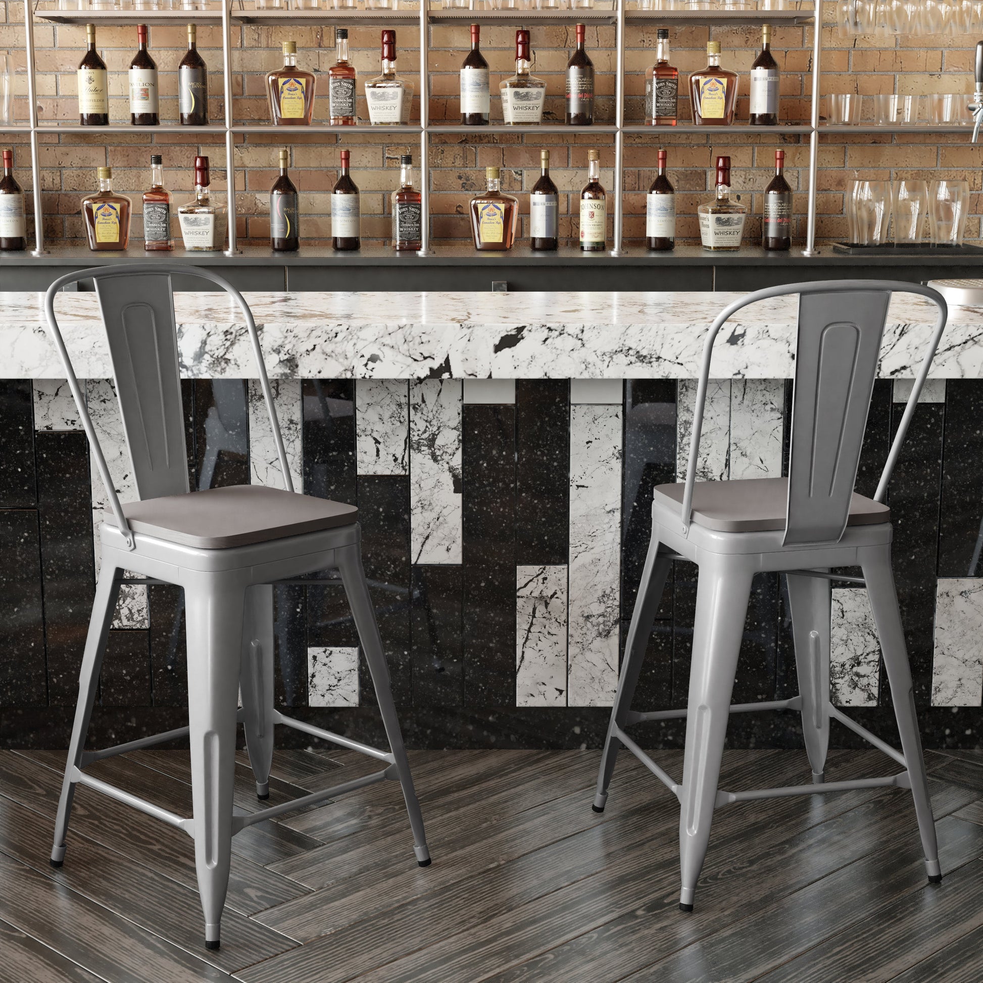 Kai Commercial Grade 24" High Silver Metal Indoor-Outdoor Counter Height Stool with Removable Back and Gray All-Weather Poly Resin Seat Dimensions: 17.75"W x 20"D x 39.25"H