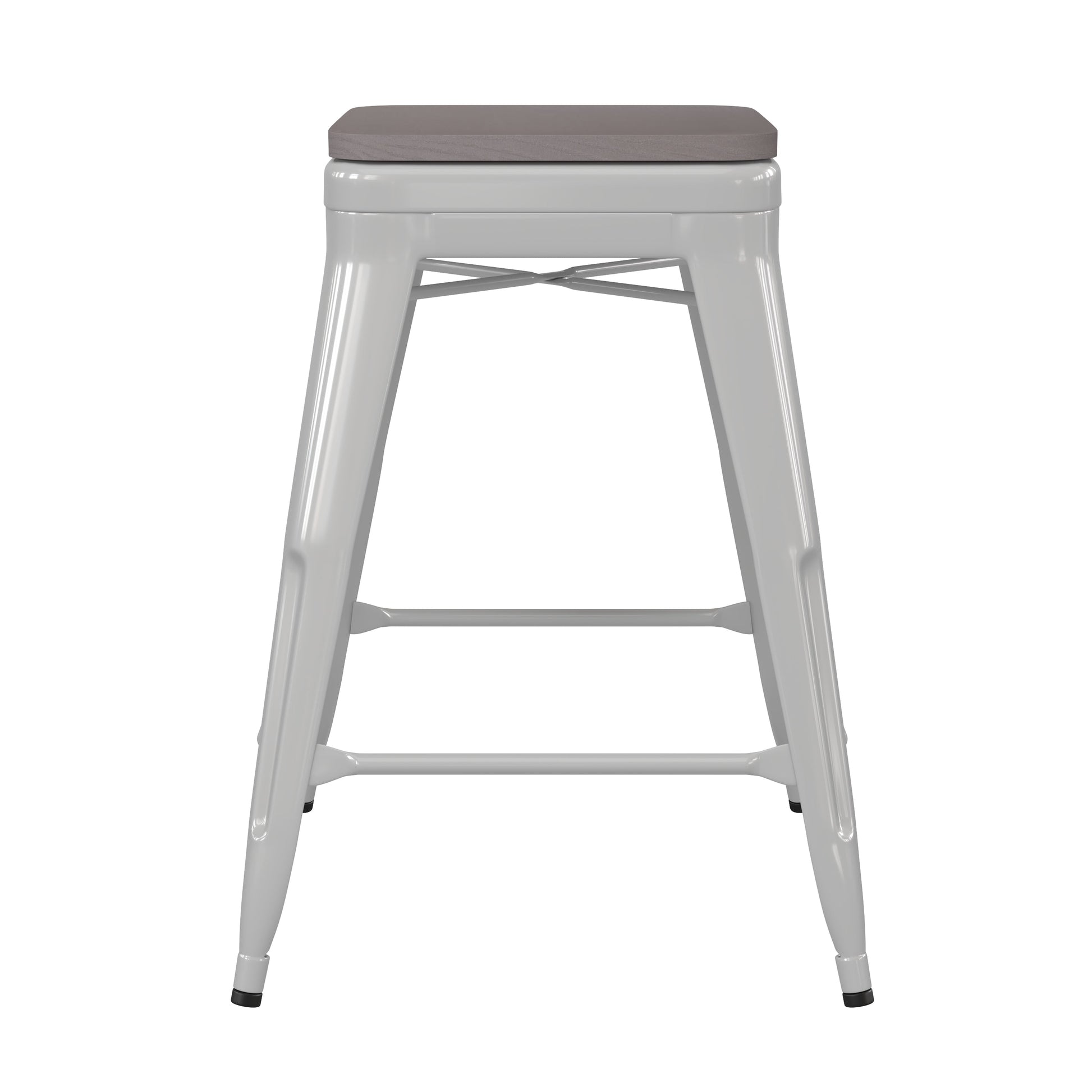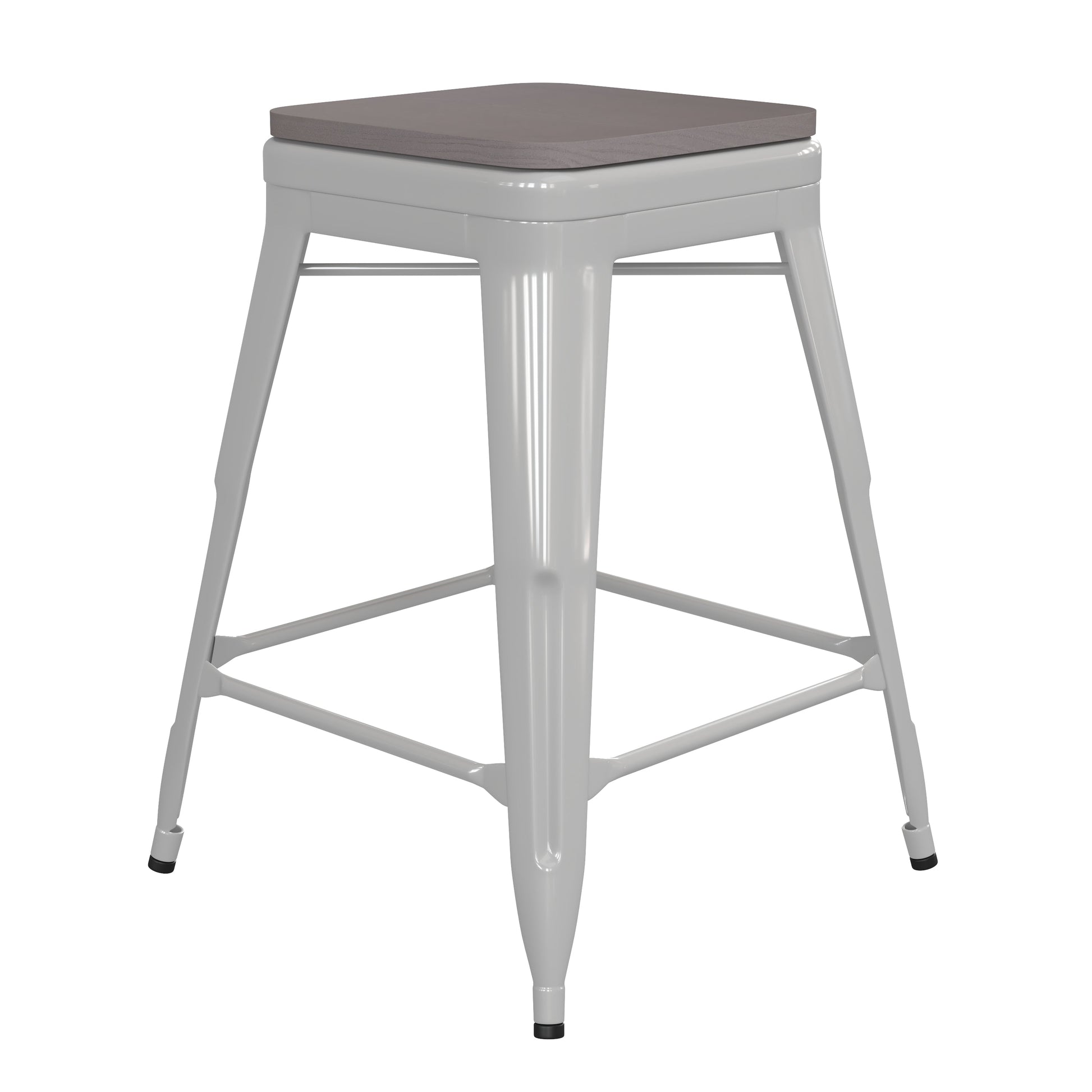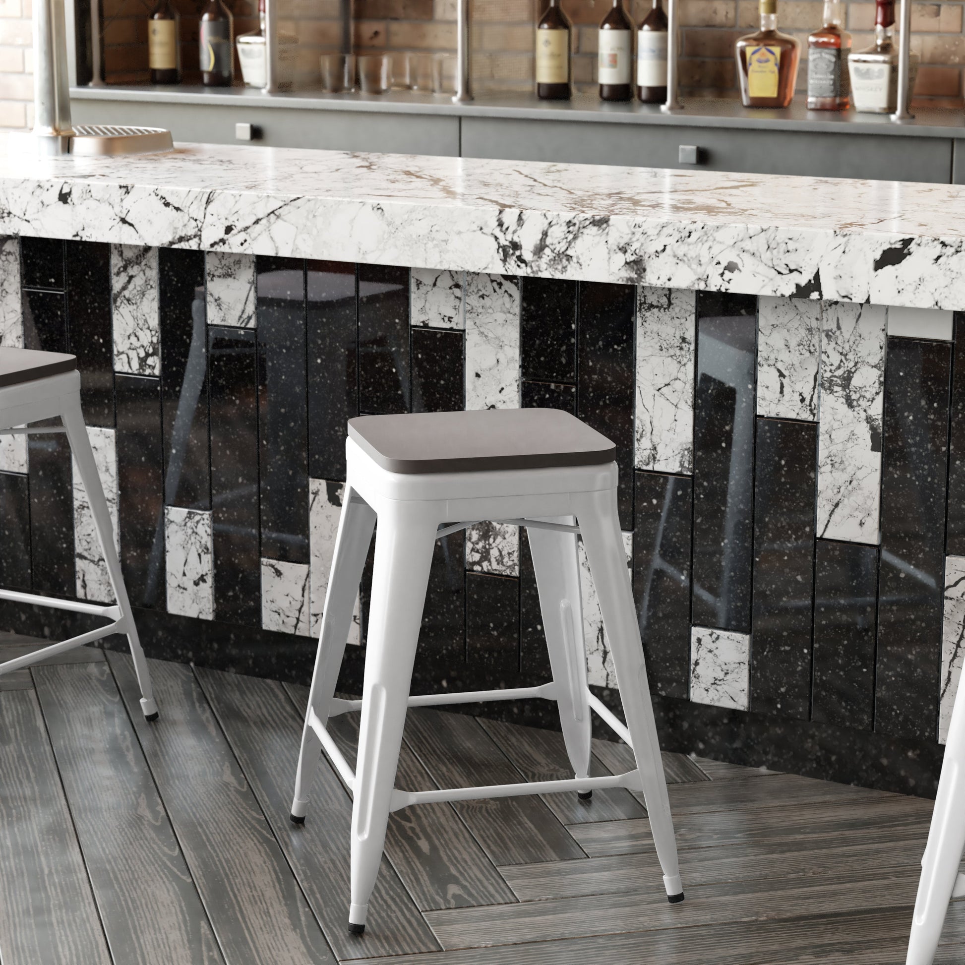 Kai Commercial Grade 24" High Backless White Metal Indoor-Outdoor Counter Height Stool with Gray Poly Resin Wood Seat Dimensions: 16"W x 16"D x 24.75"H
