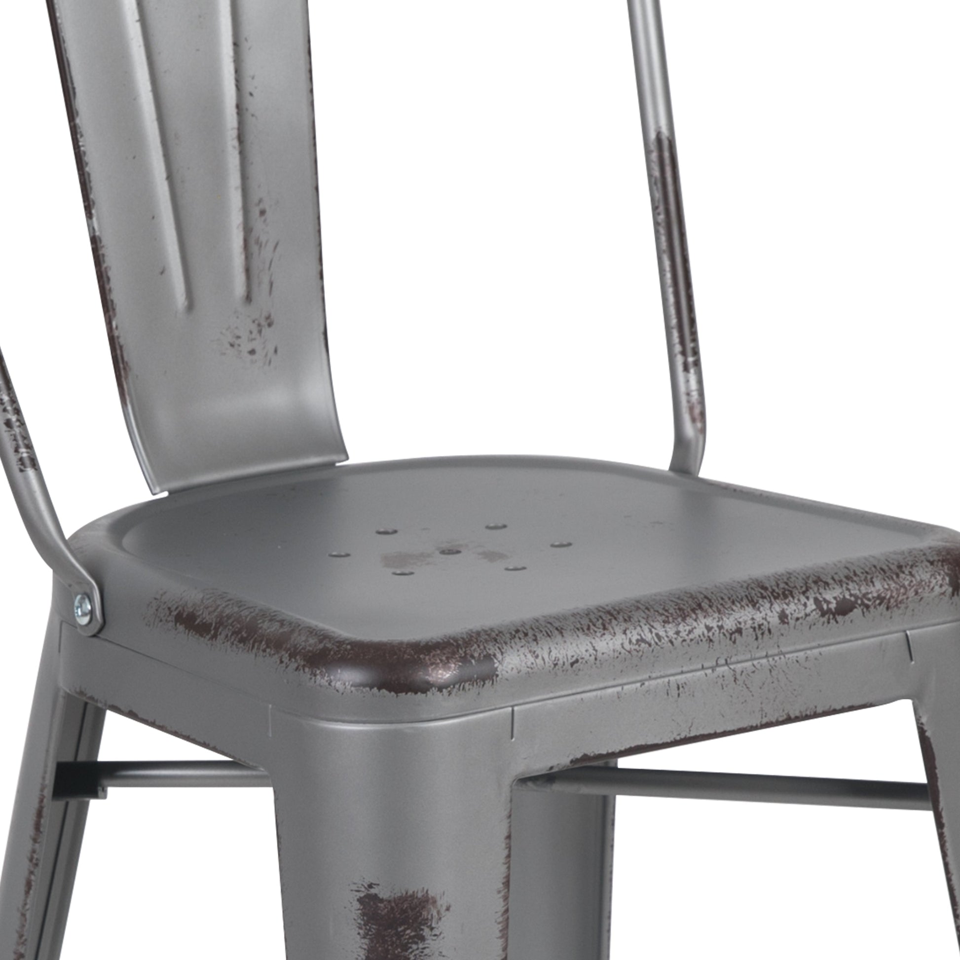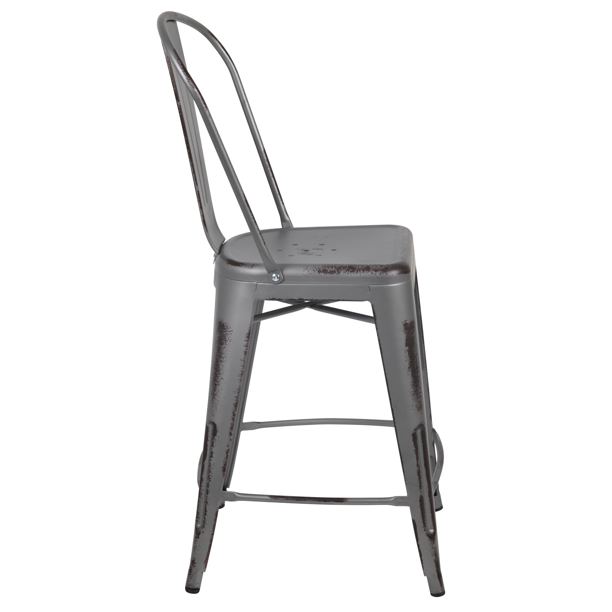 Carly Commercial Grade 24" High Distressed Silver Gray Metal Indoor-Outdoor Counter Height Stool with Back Dimensions: 17.75"W x 22"D x 40.25"H