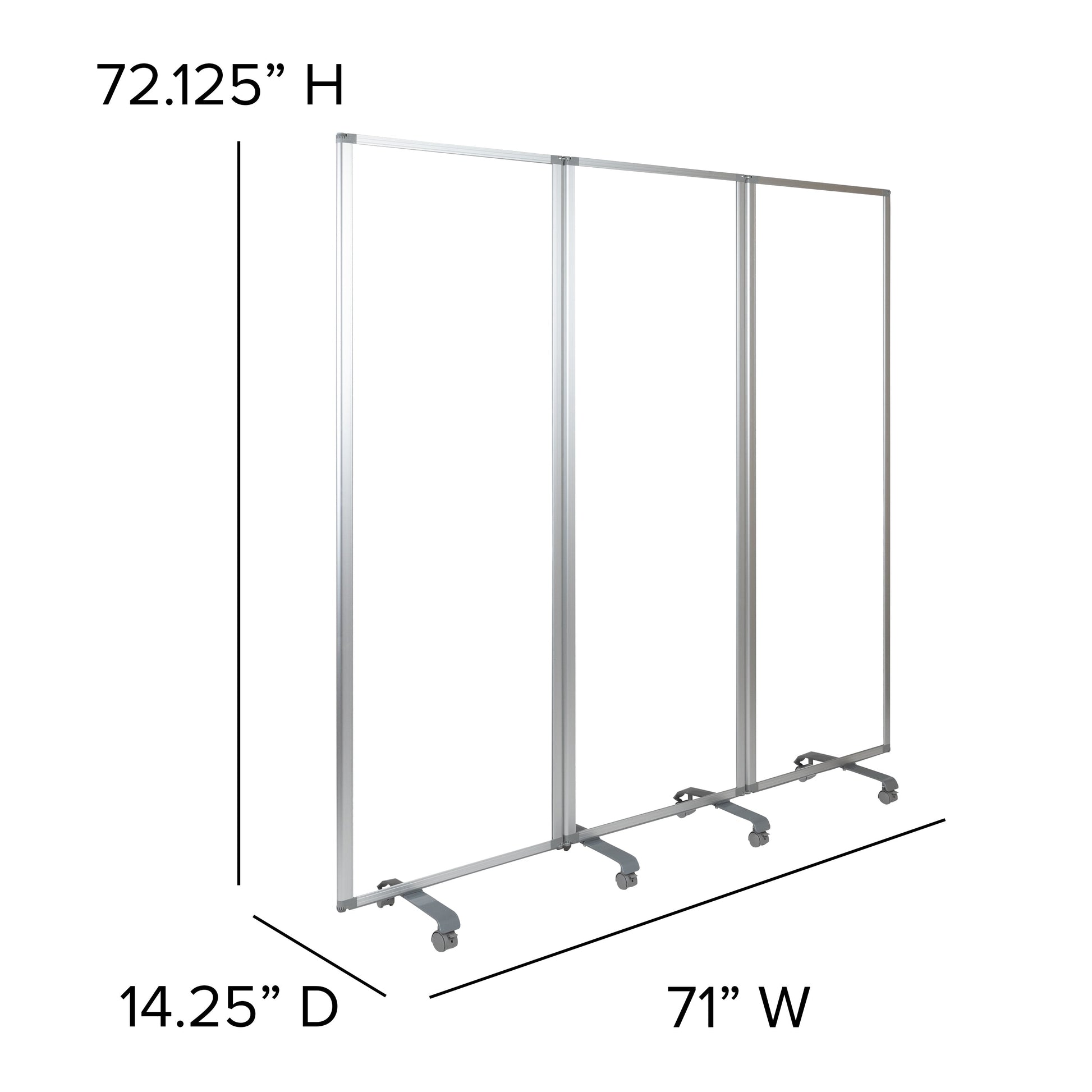 Raisley Transparent Acrylic Mobile Partition with Lockable Casters, 72"H x 24"L (3 Sections Included) Dimensions: 23.75" - 71"W x 0.9375" - 14"D x 72.125"H