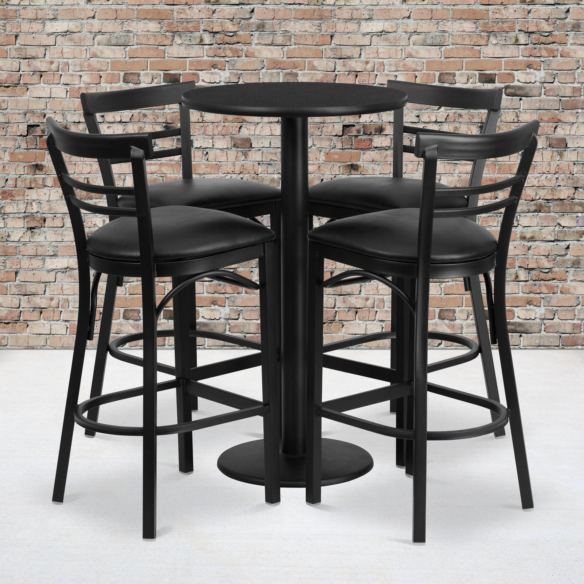 Jamie 24'' Round Black Laminate Table Set with Round Base and 4 Two-Slat Ladder Back Metal Barstools - Black Vinyl Seat Dimensions: 24"W x 24"D x 42"H