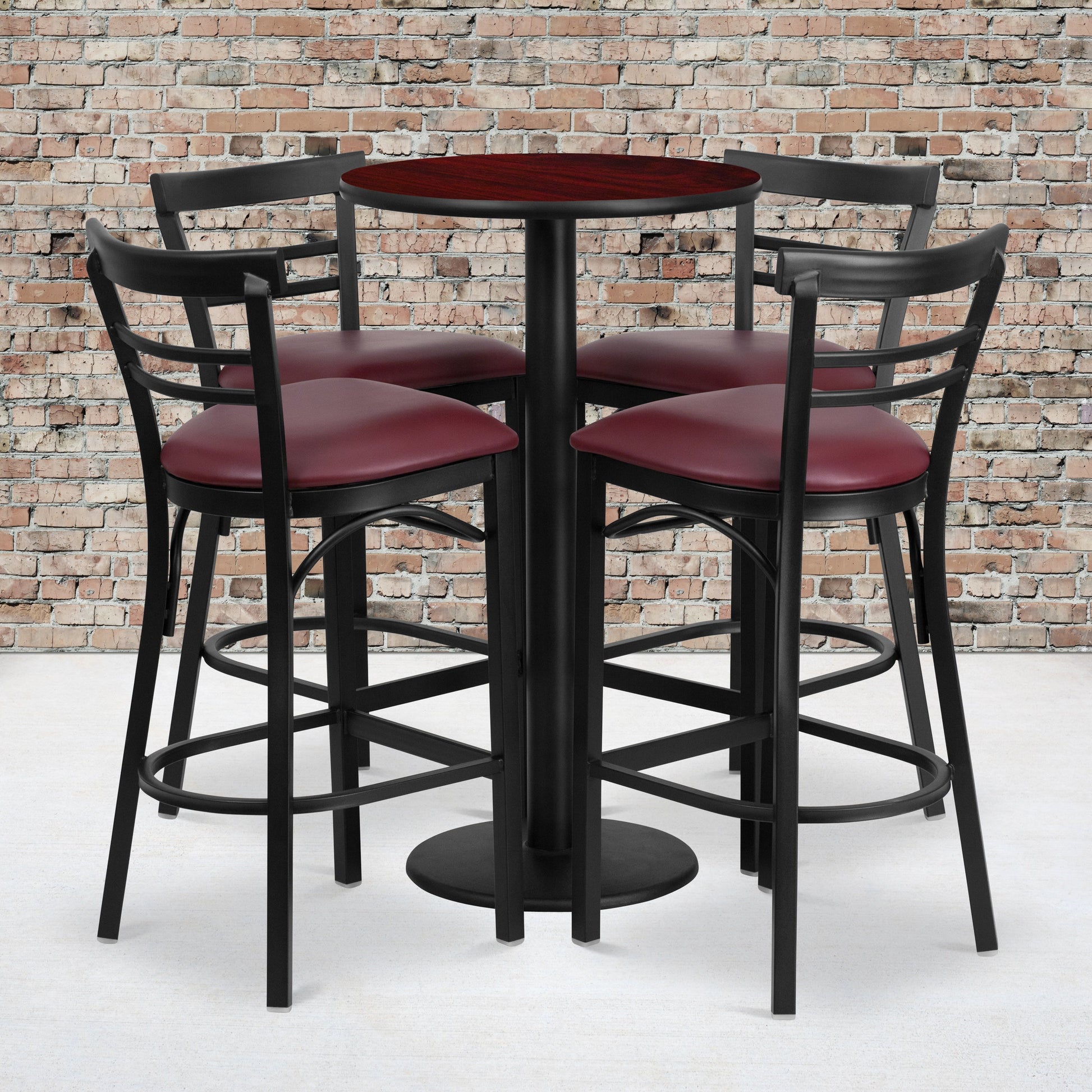 Jamie 24'' Round Mahogany Laminate Table Set with Round Base and 4 Two-Slat Ladder Back Metal Barstools - Burgundy Vinyl Seat Dimensions: 24"W x 24"D x 42"H