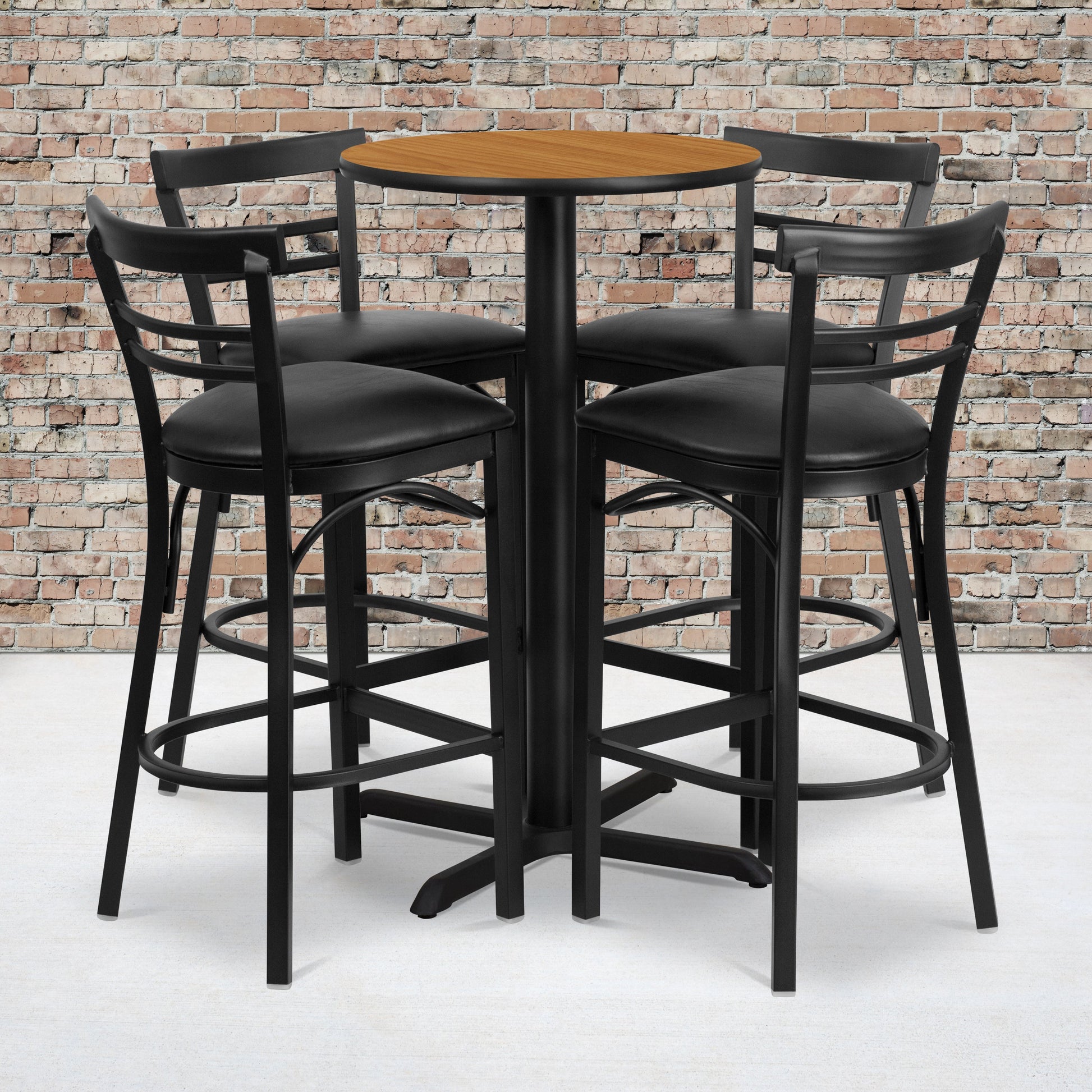 Carlton 24'' Round Natural Laminate Table Set with X-Base and 4 Two-Slat Ladder Back Metal Barstools - Black Vinyl Seat Dimensions: 24"W x 24"D x 42"H