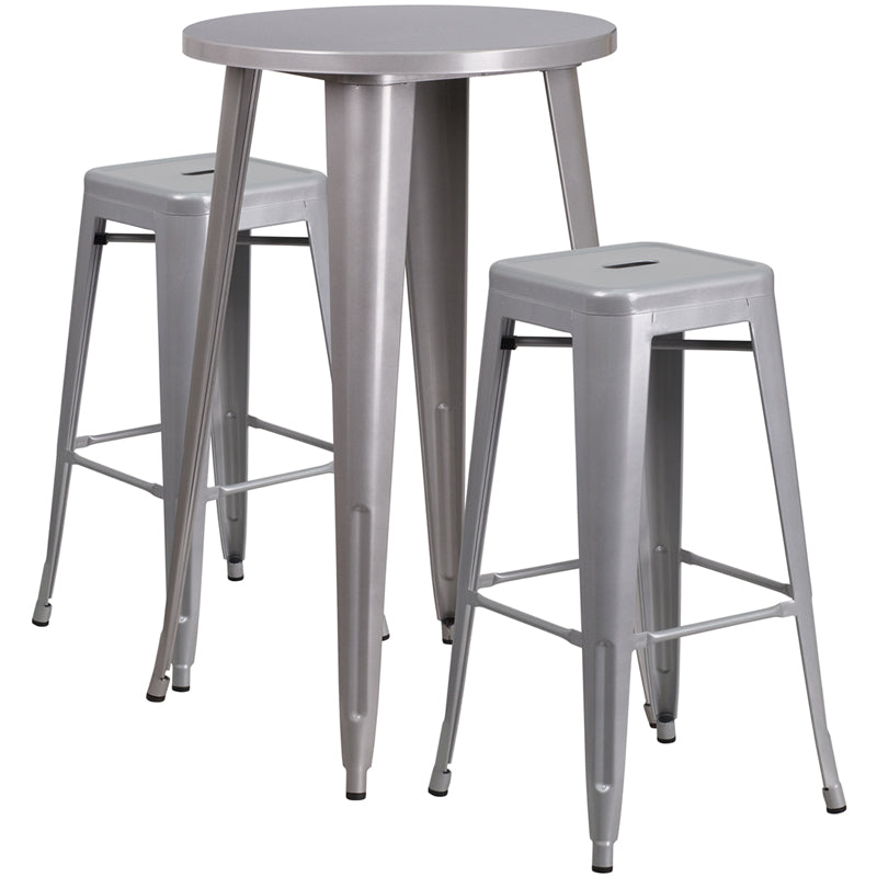 Douglas Commercial Grade 24" Round Silver Metal Indoor-Outdoor Bar Table Set with 2 Square Seat Backless Stools Dimensions: 24"W x 24"D x 41"H