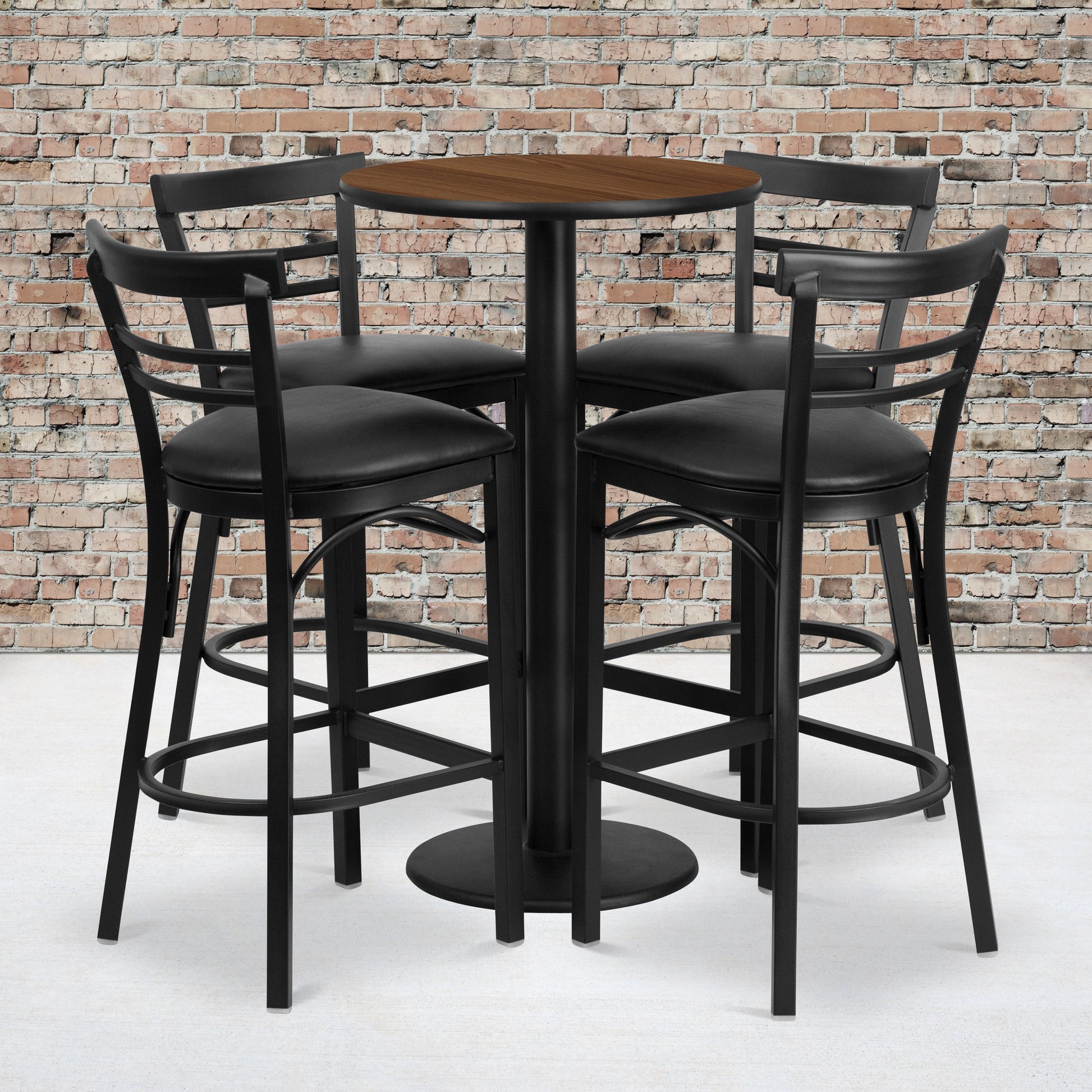 Jamie 24'' Round Walnut Laminate Table Set with Round Base and 4 Two-Slat Ladder Back Metal Barstools - Black Vinyl Seat Dimensions: 24"W x 24"D x 42"H