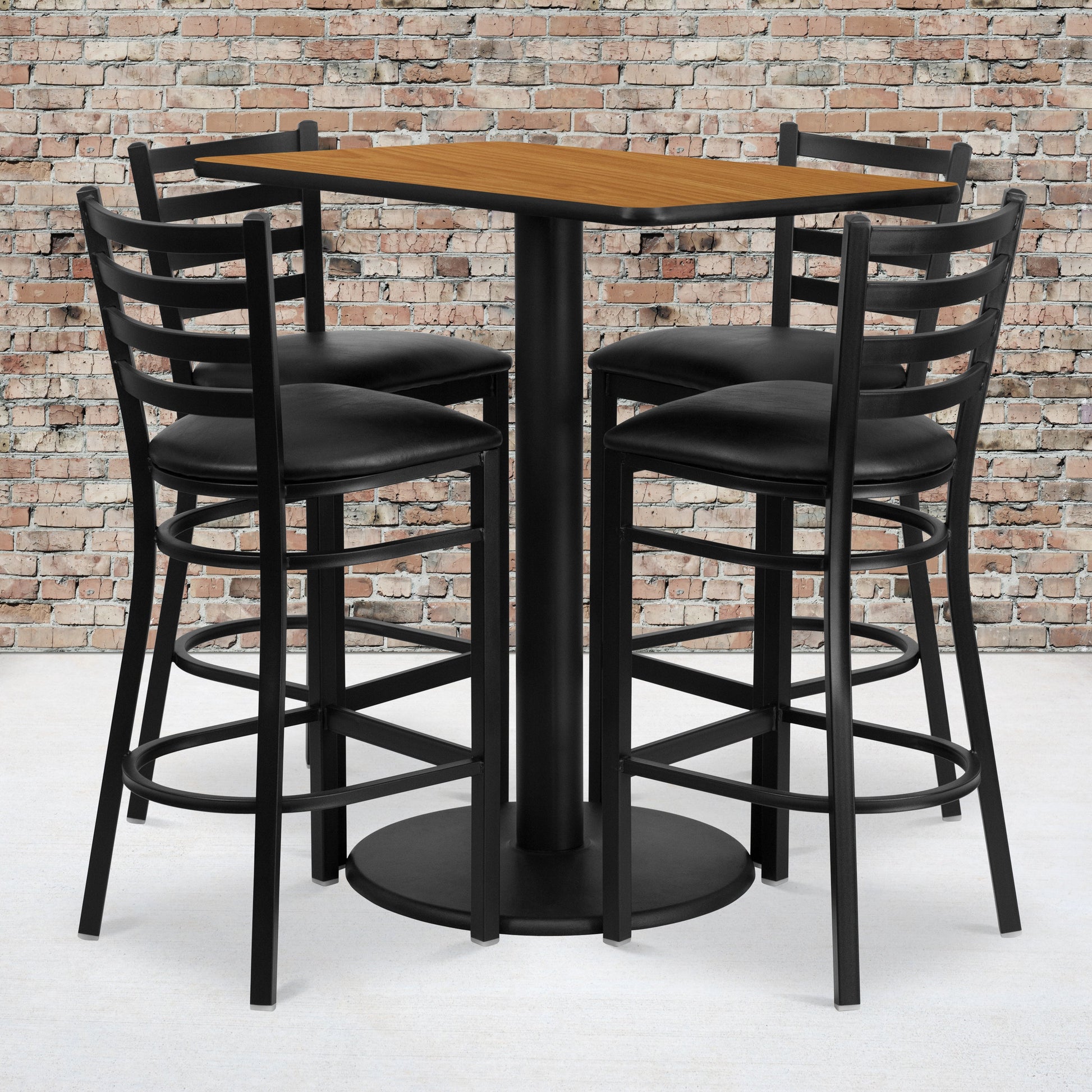 Jamie 24'' x 42'' Rectangular Natural Laminate Table Set with 4 Ladder Back Metal Barstools - Black Vinyl Seat Dimensions: 24"W x 42"D x 42"H