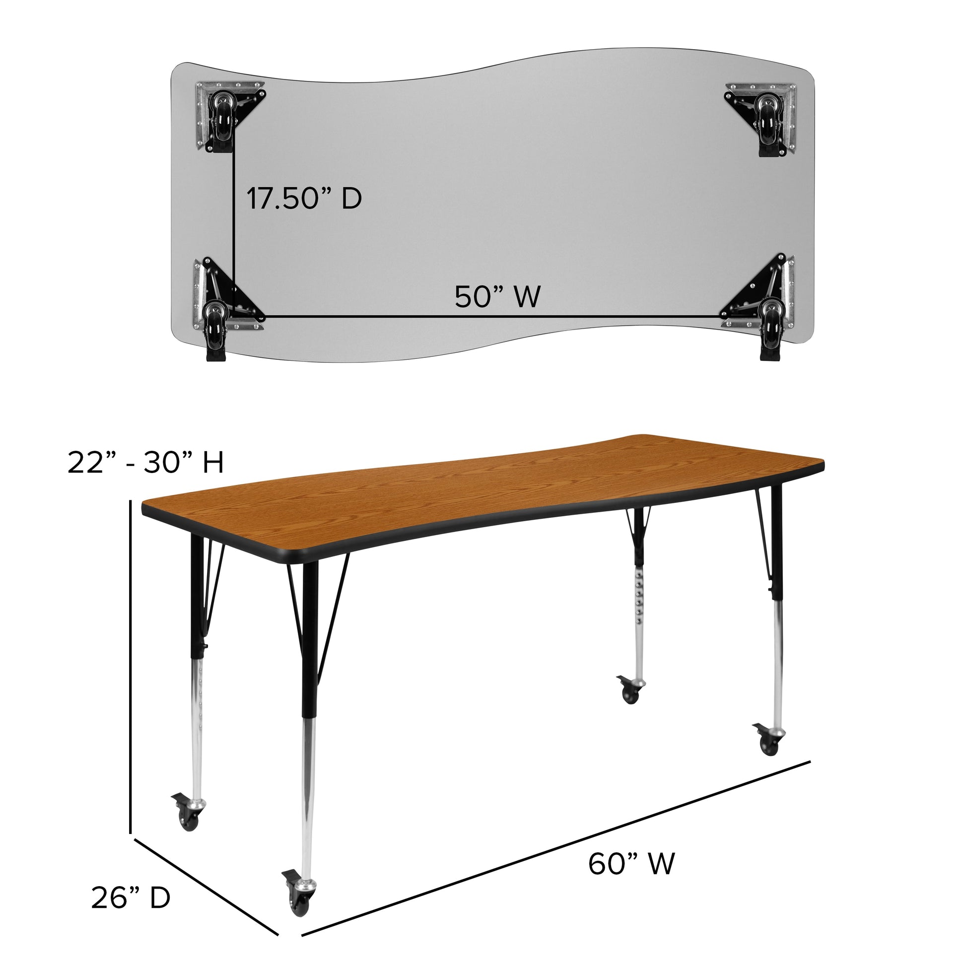 Wren Mobile 26"W x 60"L Rectangle Wave Flexible Collaborative Oak Laminate Activity Table - Standard Height Adjust Legs Dimensions: 26"W x 60"D x 22" - 30"H