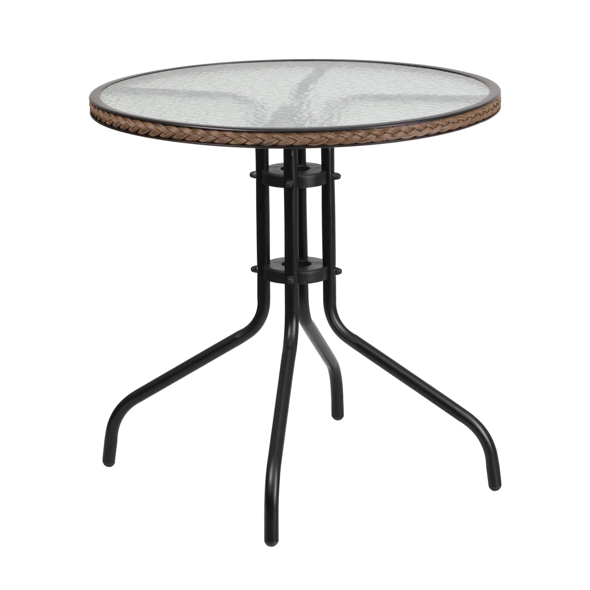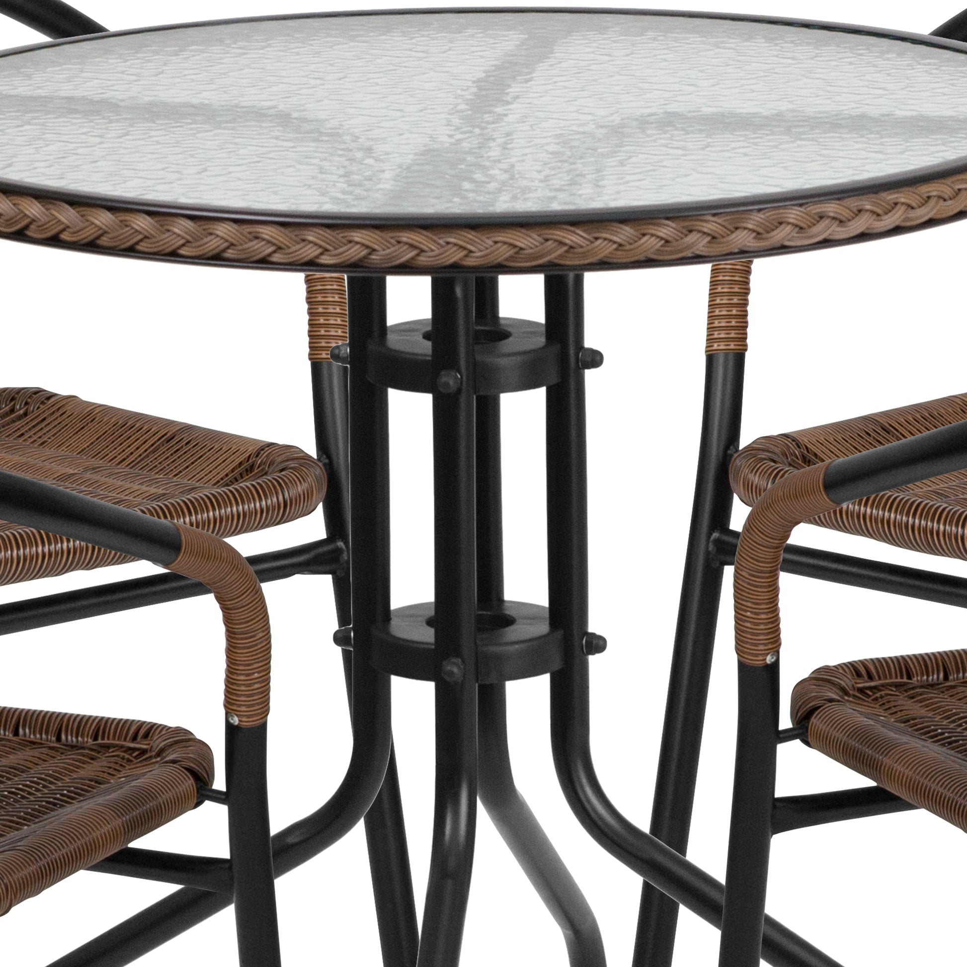 Lila 28'' Round Glass Metal Table with Dark Brown Rattan Edging and 4 Dark Brown Rattan Stack Chairs Dimensions: 28.75"W x 28.75"D x 28"H
