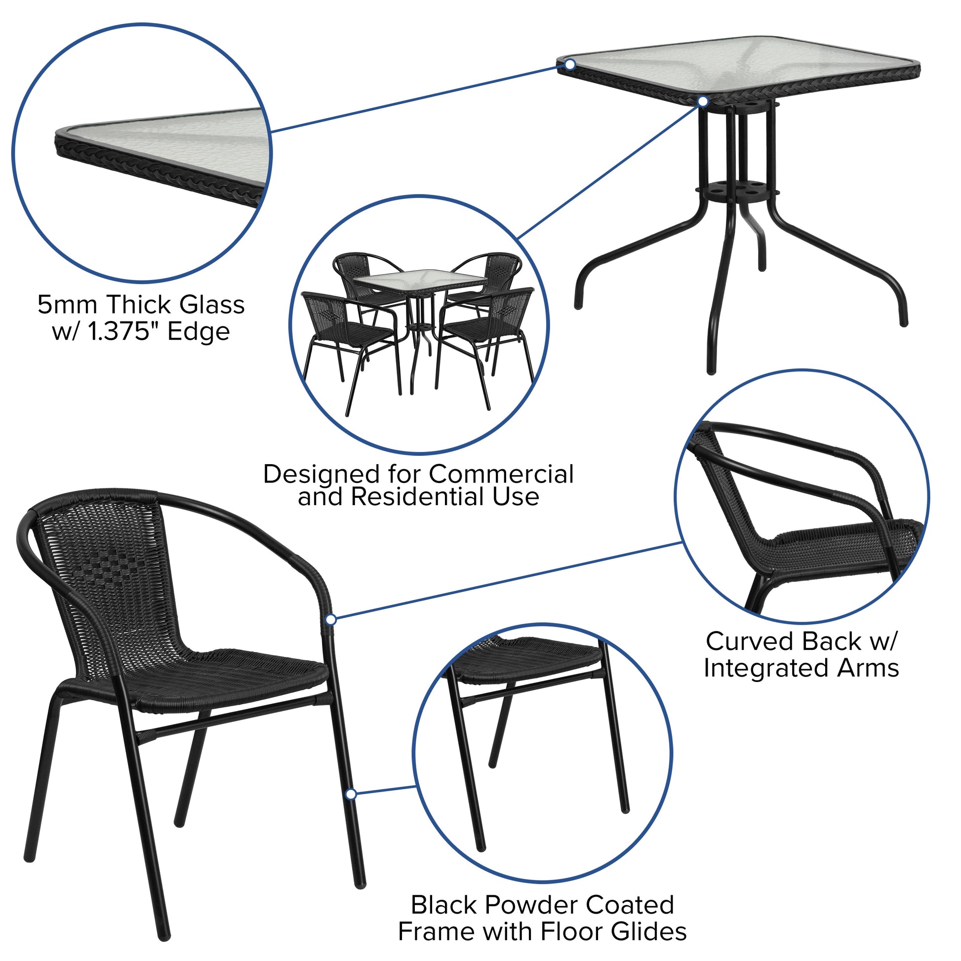 Lila 28'' Square Glass Metal Table with Black Rattan Edging and 4 Black Rattan Stack Chairs Dimensions: 28"W x 28"D x 28"H