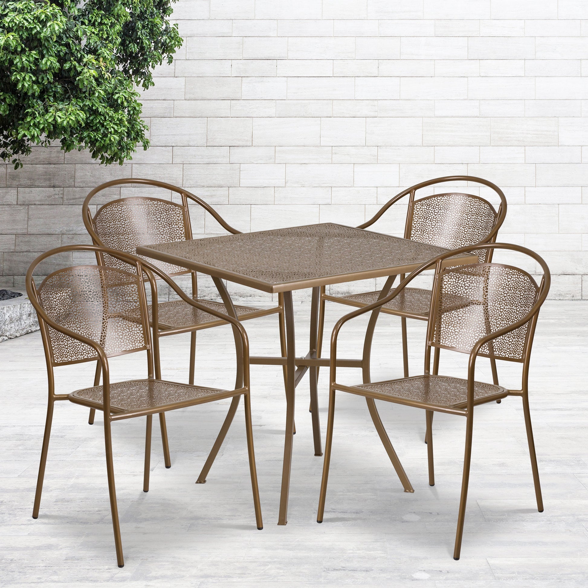 Oia Commercial Grade 28" Square Gold Indoor-Outdoor Steel Patio Table Set with 4 Round Back Chairs Dimensions: 28"W x 28"D x 28.25"H