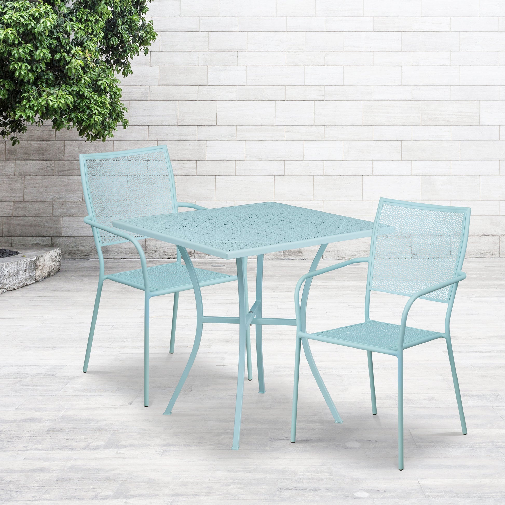 Oia Commercial Grade 28" Square Sky Blue Indoor-Outdoor Steel Patio Table Set with 2 Square Back Chairs Dimensions: 28"W x 28"D x 28.25"H