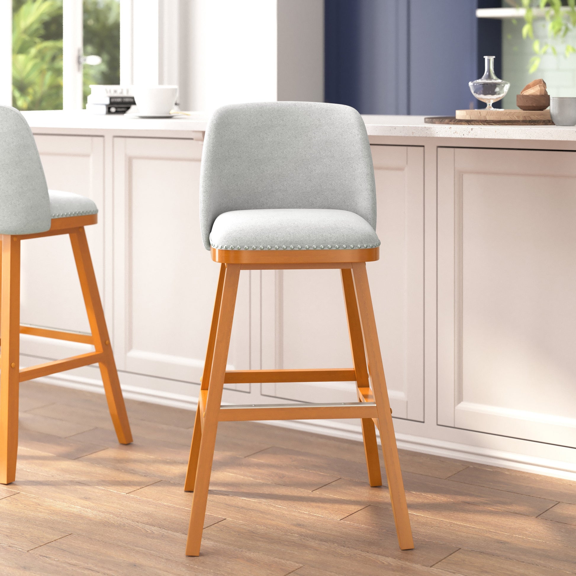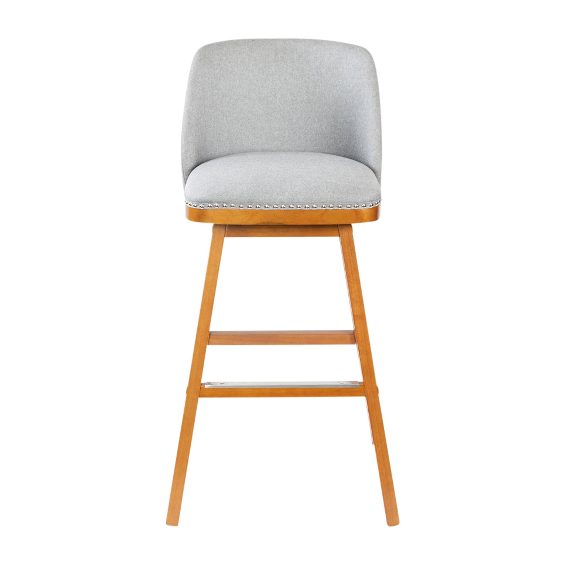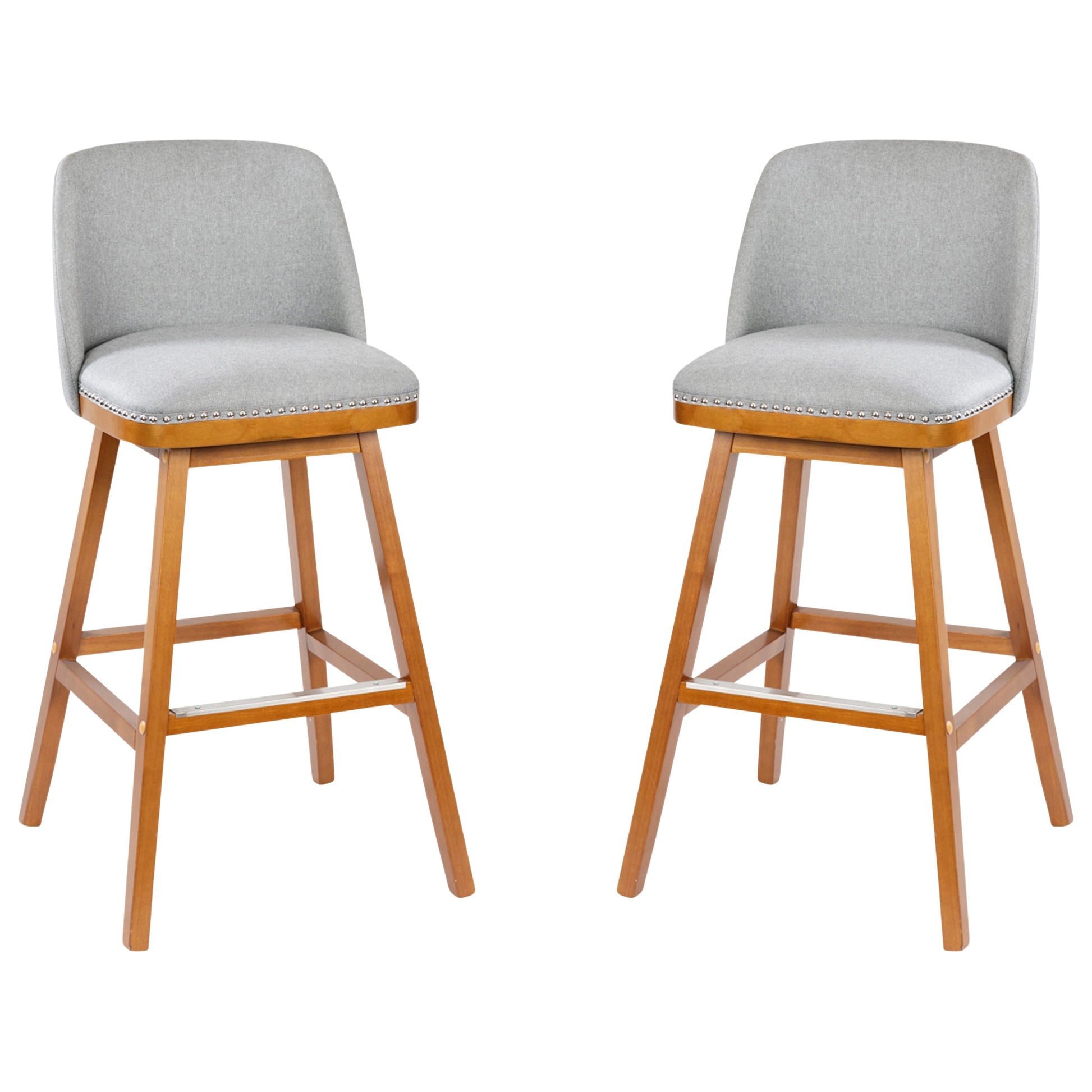 Julia Set of 2 Transitional 30 Inch Faux Linen Upholstered Barstools with Silver Nailhead Trim and Walnut Finish Solid Wood Frames, Gray Dimensions: 20.5"W x 20.5"D x 40.75"H
