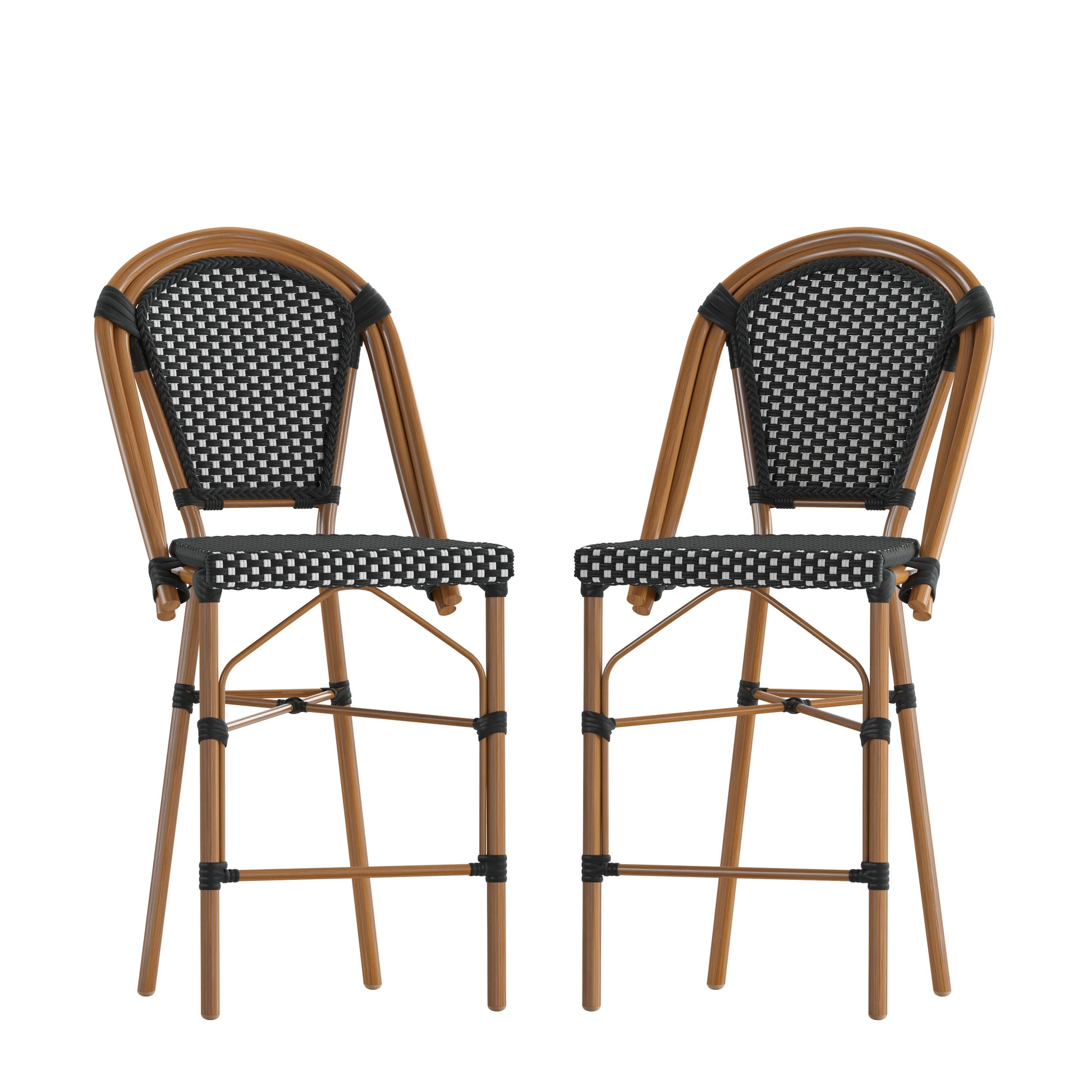 Bordeaux Set of 2 Stackable Indoor/Outdoor French Bistro 26" High Counter Height Stools, Commercial Grade, Black/White and Bamboo Finish Dimensions: 18.5"W x 21.75"D x 41.5"H