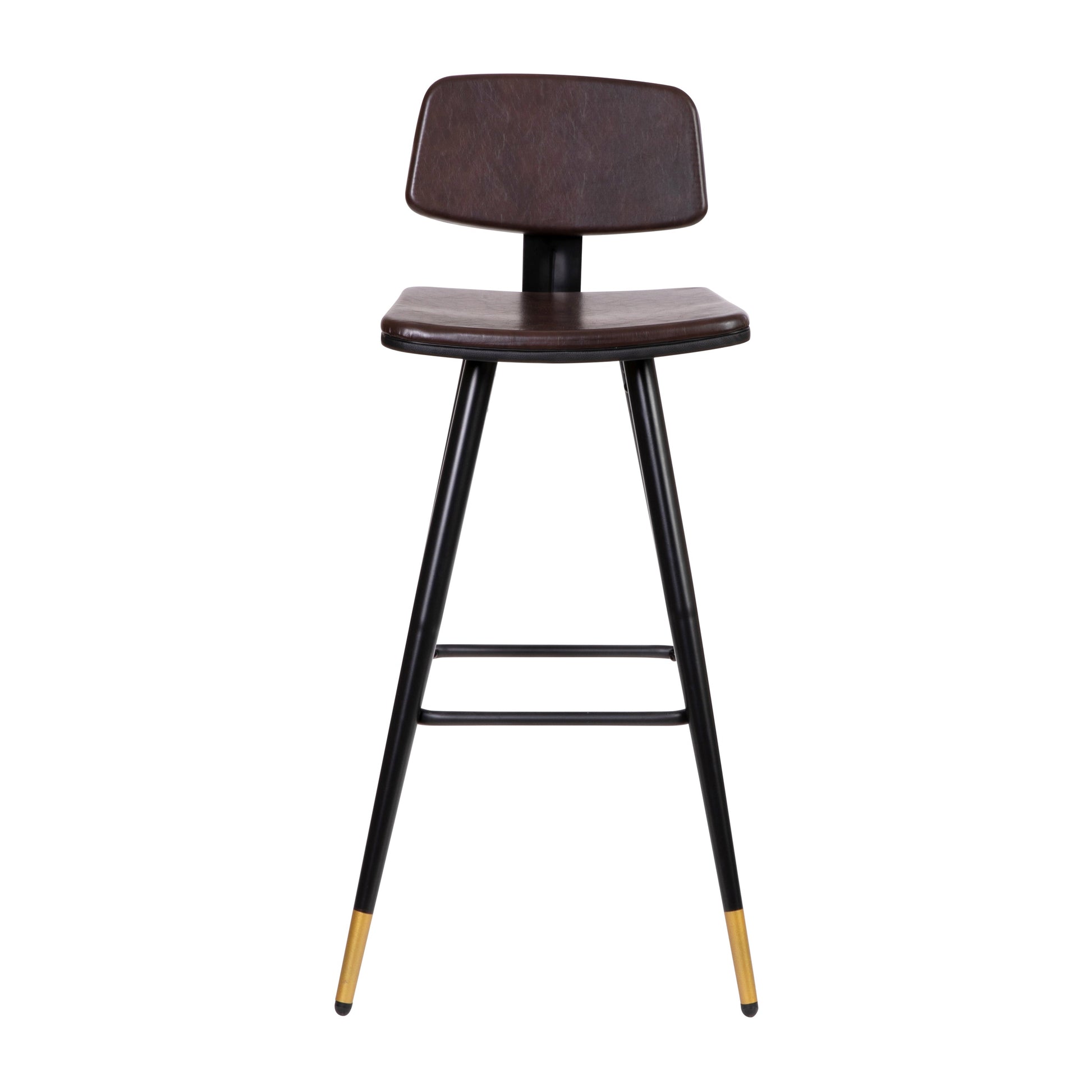 Kora Commercial Grade Low Back Barstools-Brown LeatherSoft Upholstery-Black Iron Frame-Integrated Footrest-Gold Tipped Legs-Set of 2 Dimensions: 18"W x 18"D x 39"H