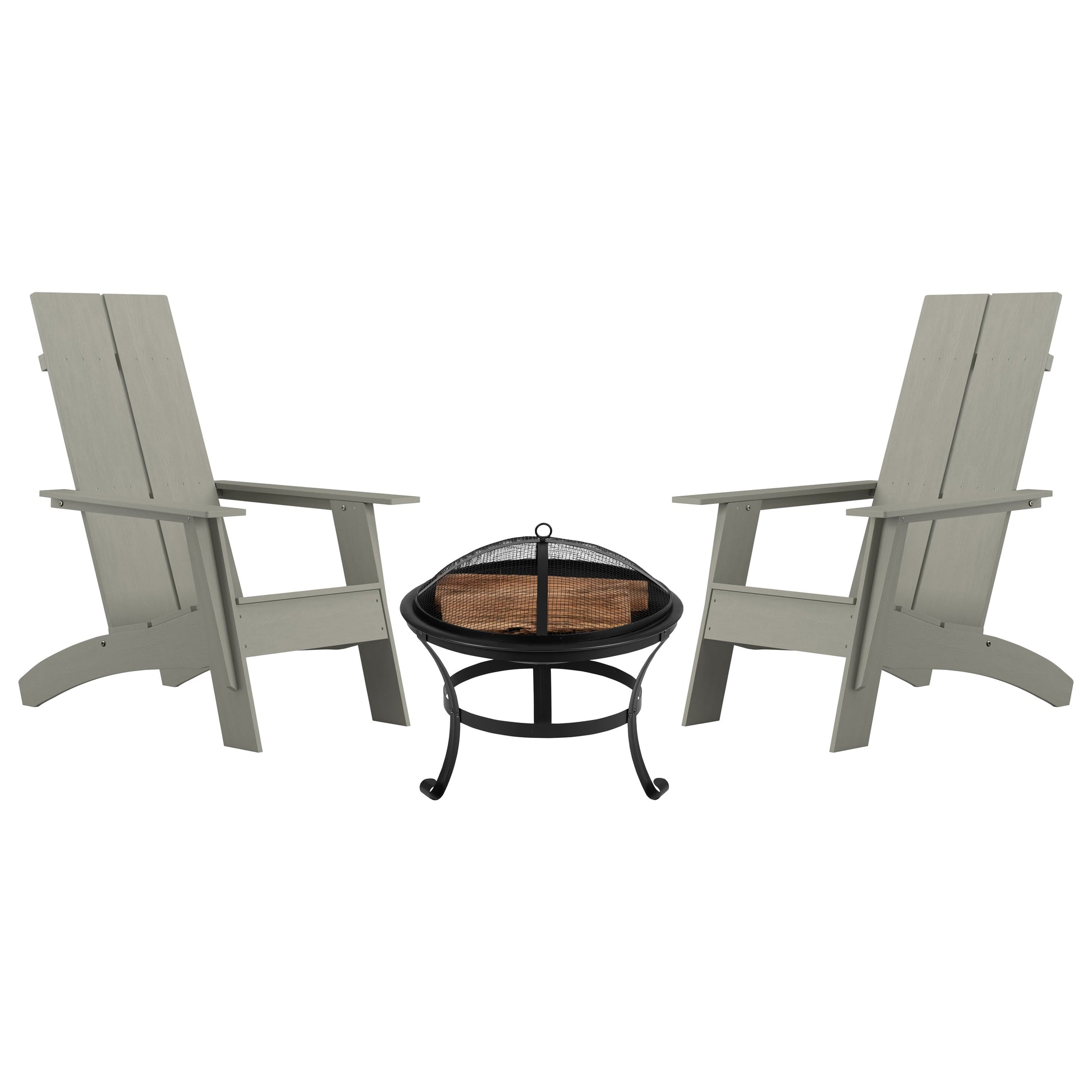 Sawyer Set of 2 Gray Modern Sawyer Commercial All-Weather 2-Slat Poly Resin Adirondack Chairs with 22" Round Wood Burning Fire Pit Dimensions: 30.5"W x 37.5"D x 39.5"H