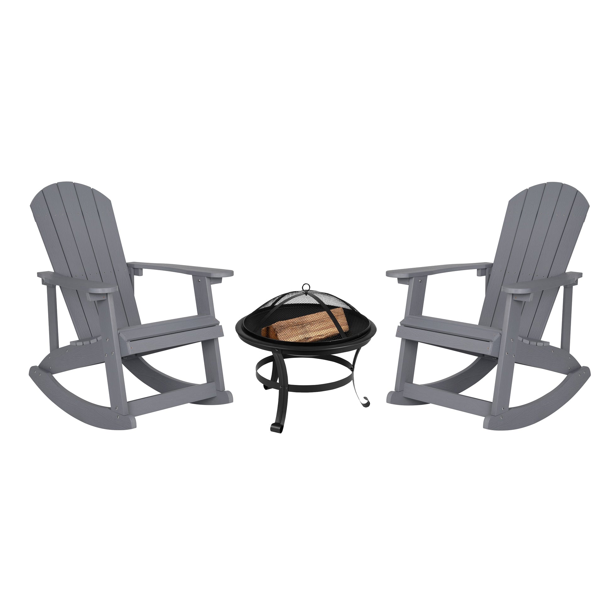 Savannah Set of 2 Gray Commercial Grade All-Weather Poly Resin Wood Adirondack Rocking Chairs with 22" Round Wood Burning Fire Pit Dimensions: 29.5"W x 37.75"D x 39.5"H