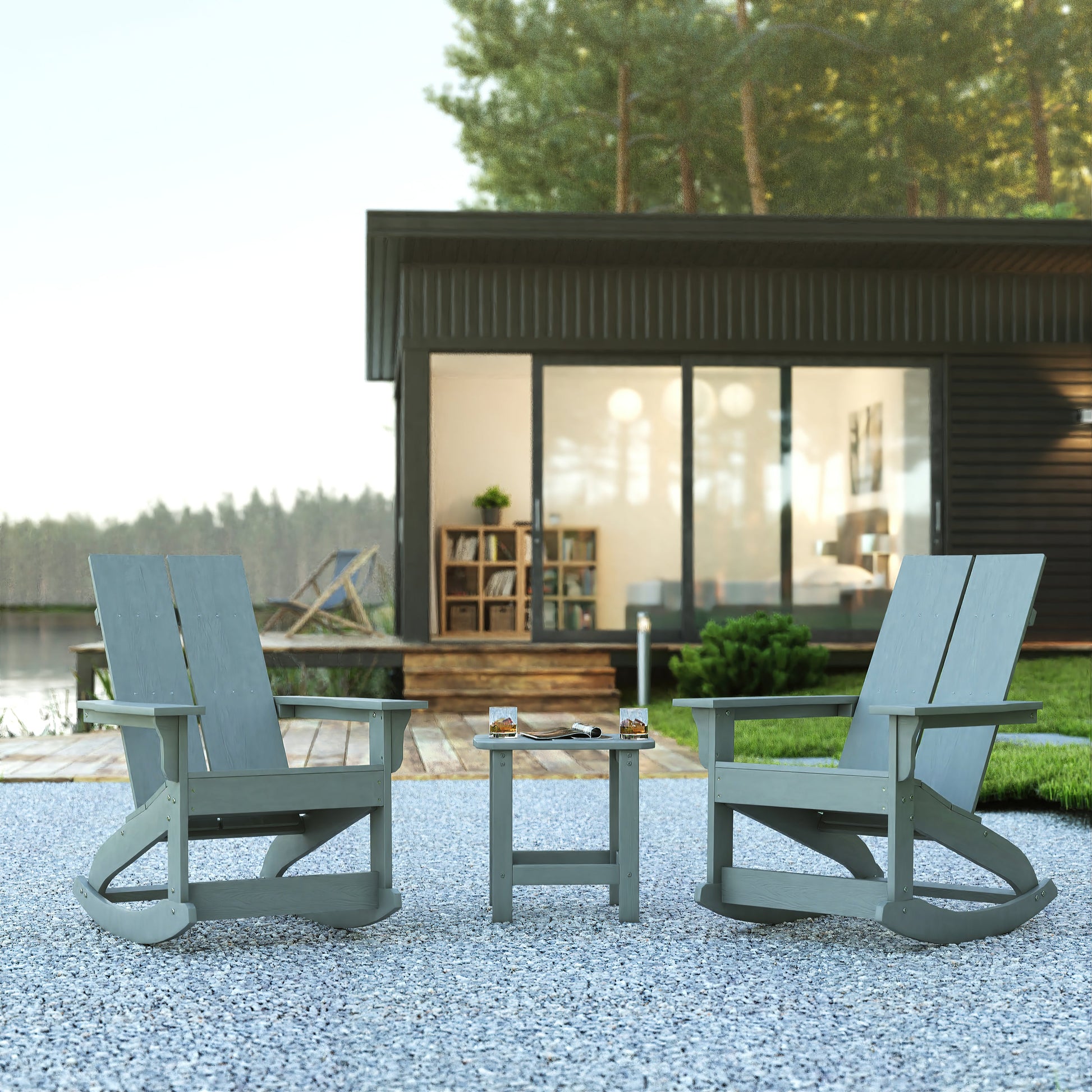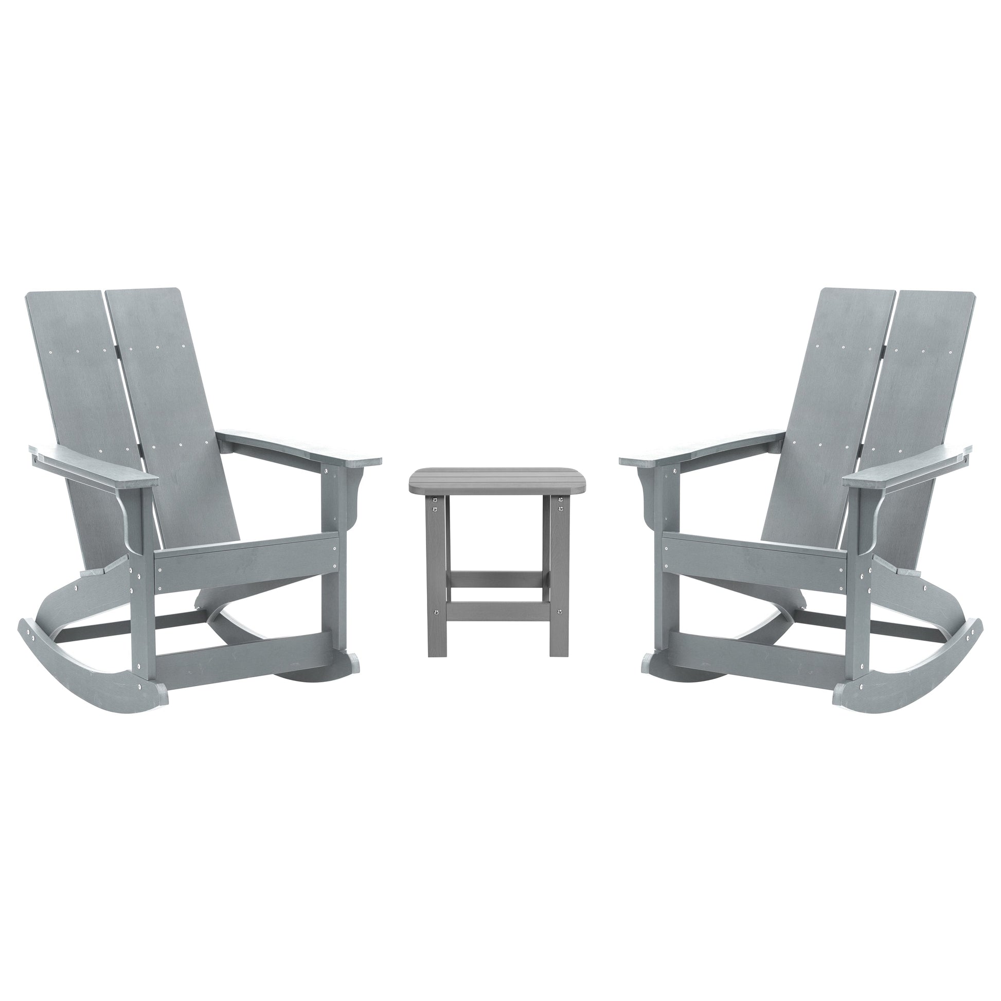 Set of 2 Gray Finn Modern Commercial Grade All-Weather 2-Slat Poly Resin Rocking Adirondack Chairs with Matching Side Table Dimensions: 29"W x 38"D x 40.5"H