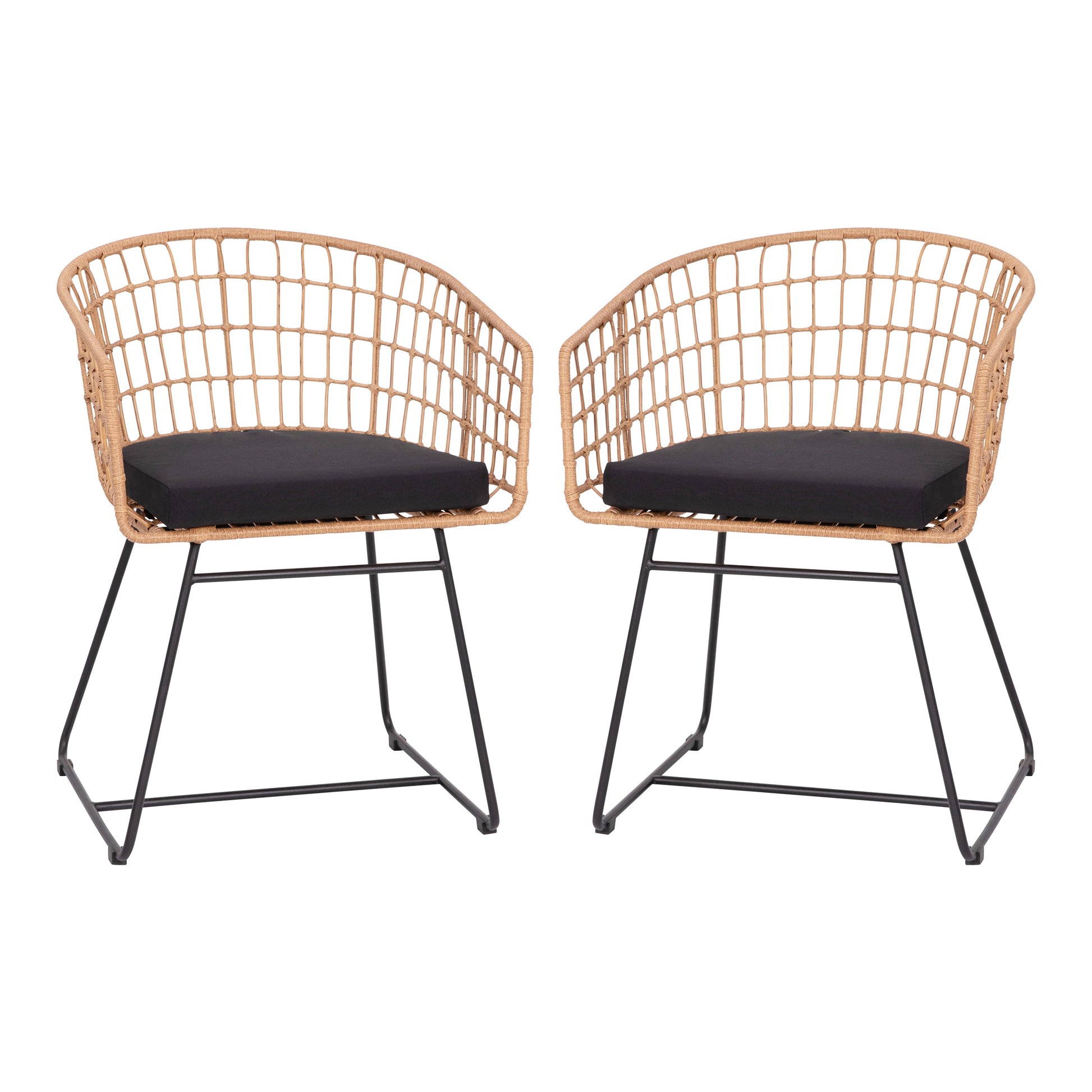 Devon Set of 2 Indoor/Outdoor Patio Boho Club Chairs, Rope with Natural PE Wicker Rattan, Black Cushions and Sled Base Dimensions: 21.25"W x 22.5"D x 29.75"H