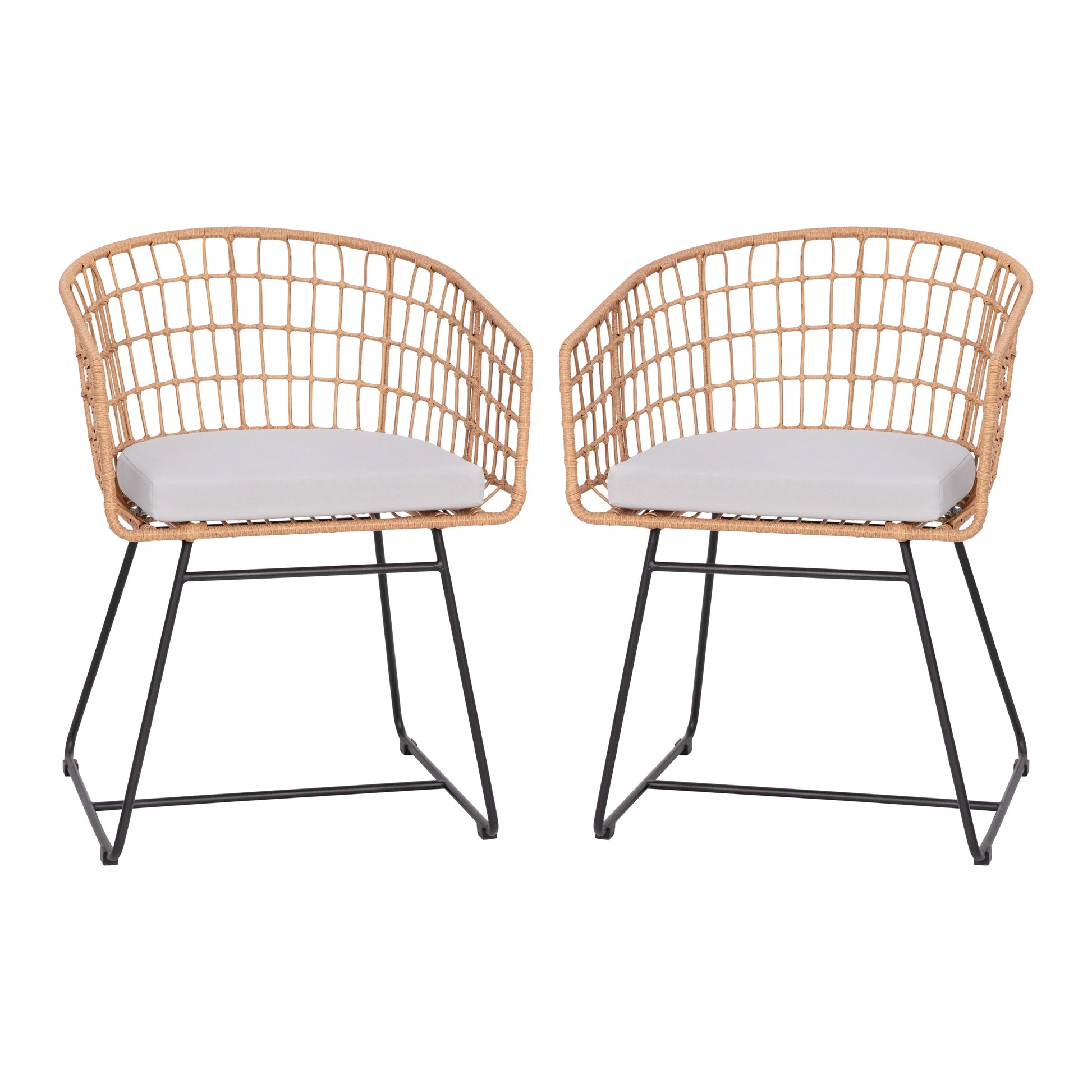 Devon Set of 2 Indoor/Outdoor Patio Boho Club Chairs, Rope with Natural PE Wicker Rattan, Light Gray Cushions and Sled Base Dimensions: 21.25"W x 22.5"D x 29.75"H
