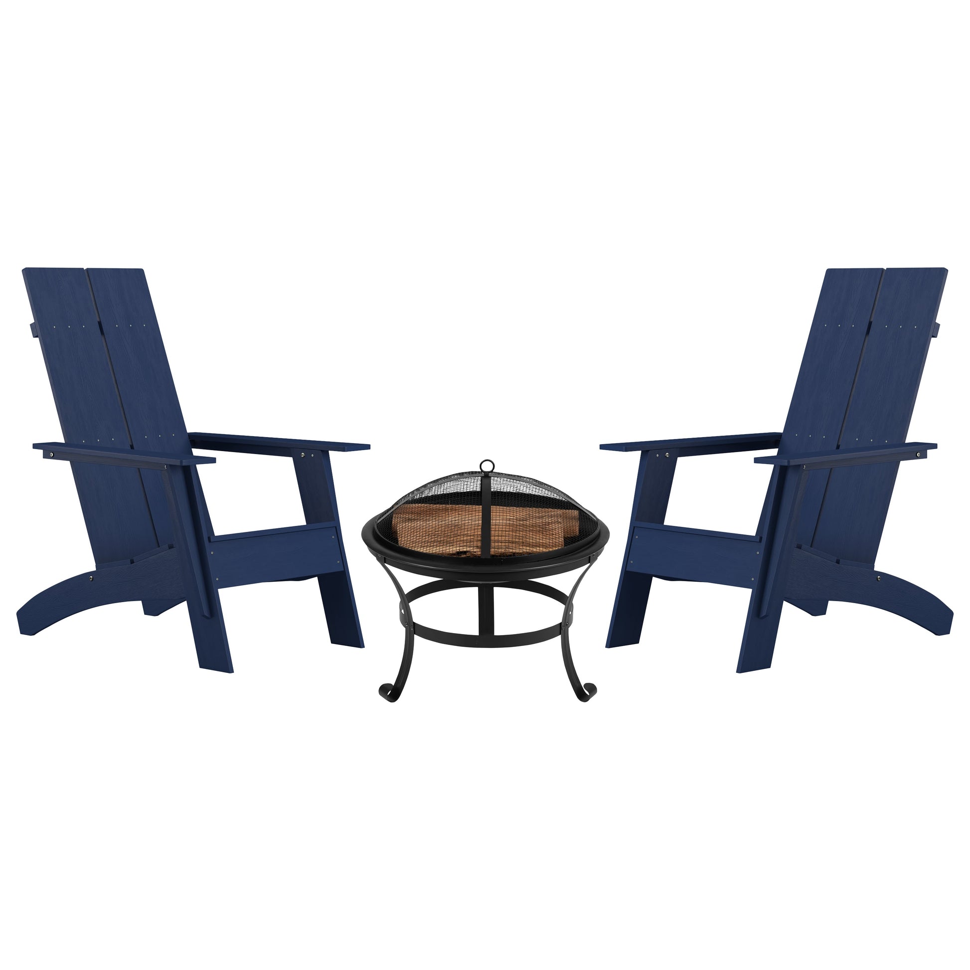 Sawyer Set of 2 Navy Modern Sawyer Commercial All-Weather 2-Slat Poly Resin Adirondack Chairs with 22" Round Wood Burning Fire Pit Dimensions: 30.5"W x 37.5"D x 39.5"H