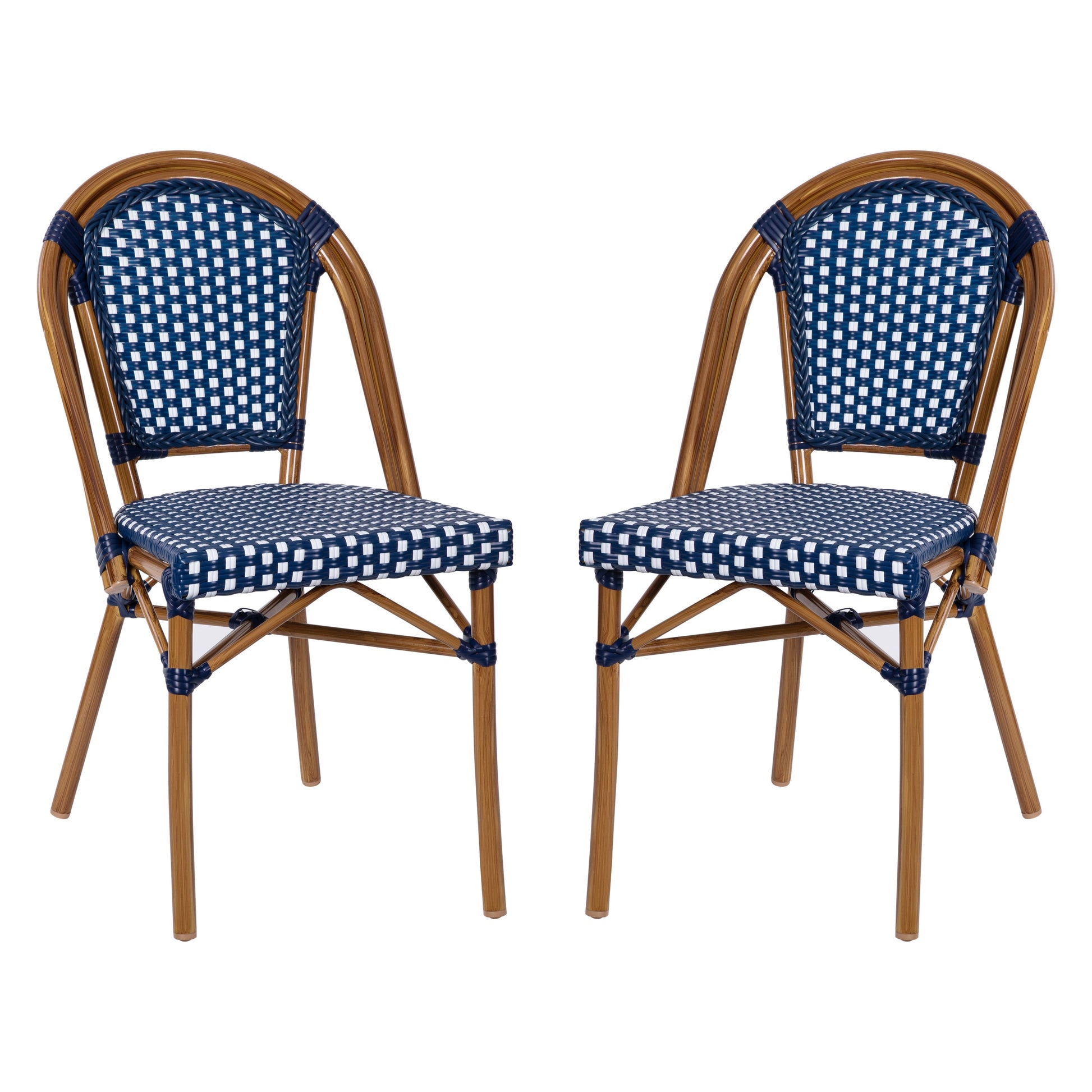 Bordeaux Set of 2 Indoor/Outdoor Commercial French Bistro Stacking Chairs, Navy/White PE Rattan Back and Seat, Bamboo Print Aluminum Frame in Natural Dimensions: 18.5"W x 22"D x 34.25"H