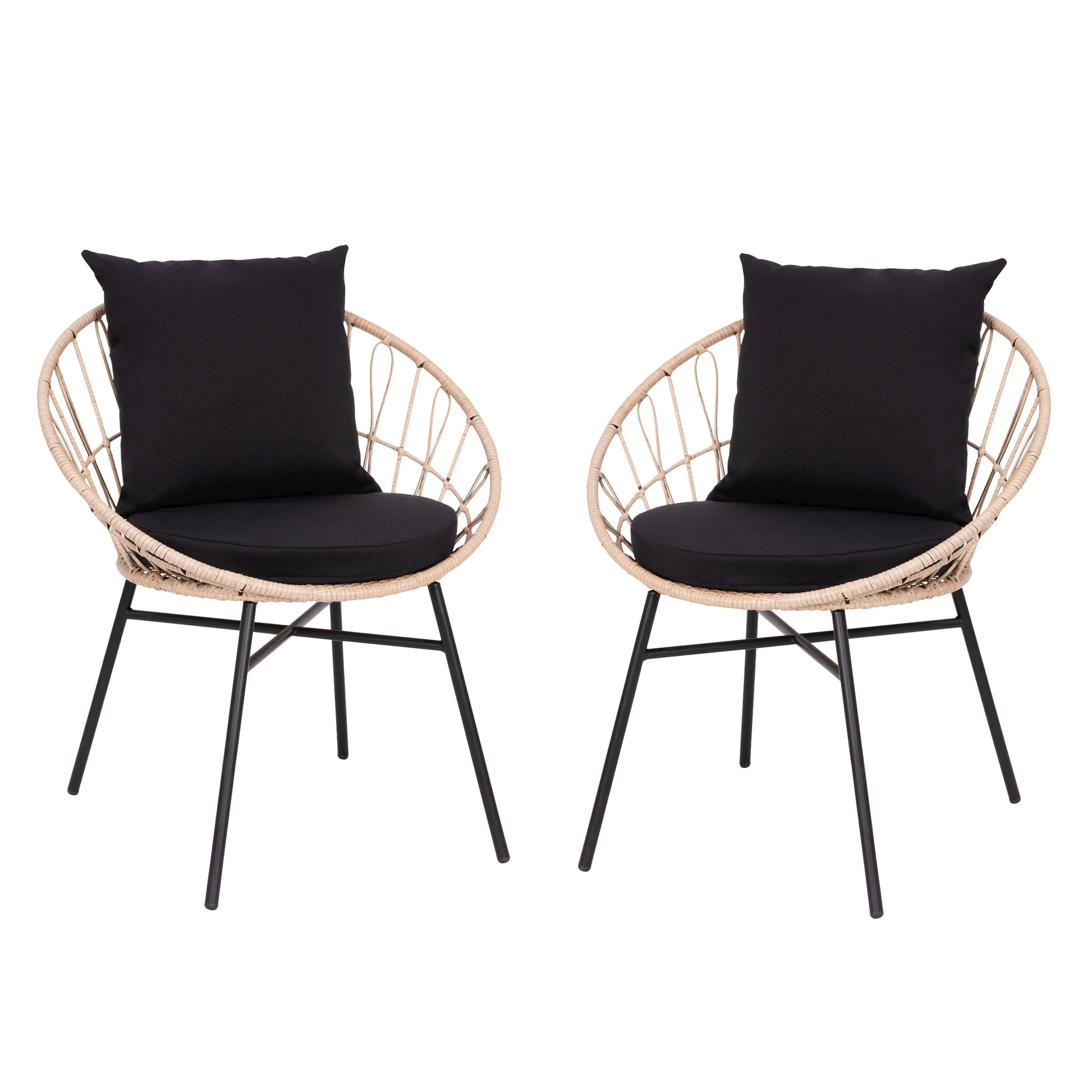 Devon Set of 2 Indoor/Outdoor Modern Papasan Patio Chairs, Rope with Tan Finish PE Wicker Rattan and Black Cushions Dimensions: 27.5"W x 23"D x 31.25"H