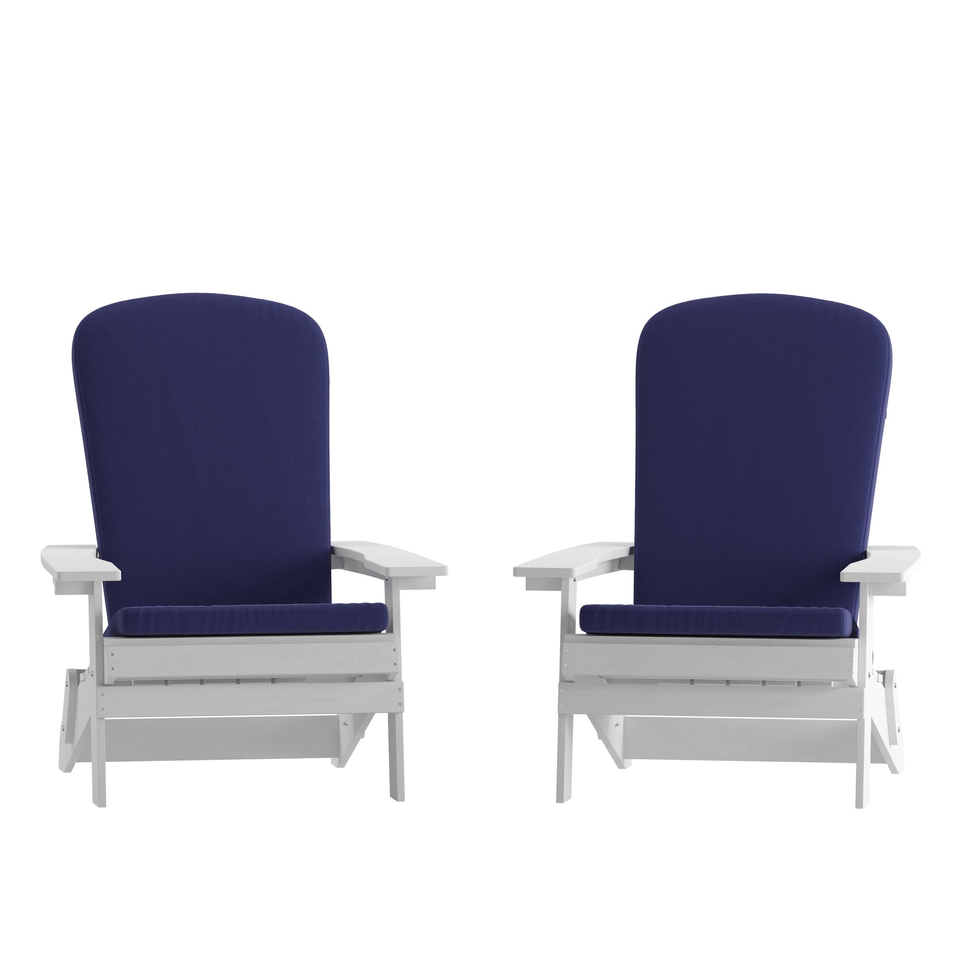 Charlestown Set of 2 All-Weather Poly Resin Indoor/Outdoor Folding Adirondack Chairs in White with Blue Cushions for Deck, Porch, and Patio Dimensions: 30.25"W x 34"D x 37"H