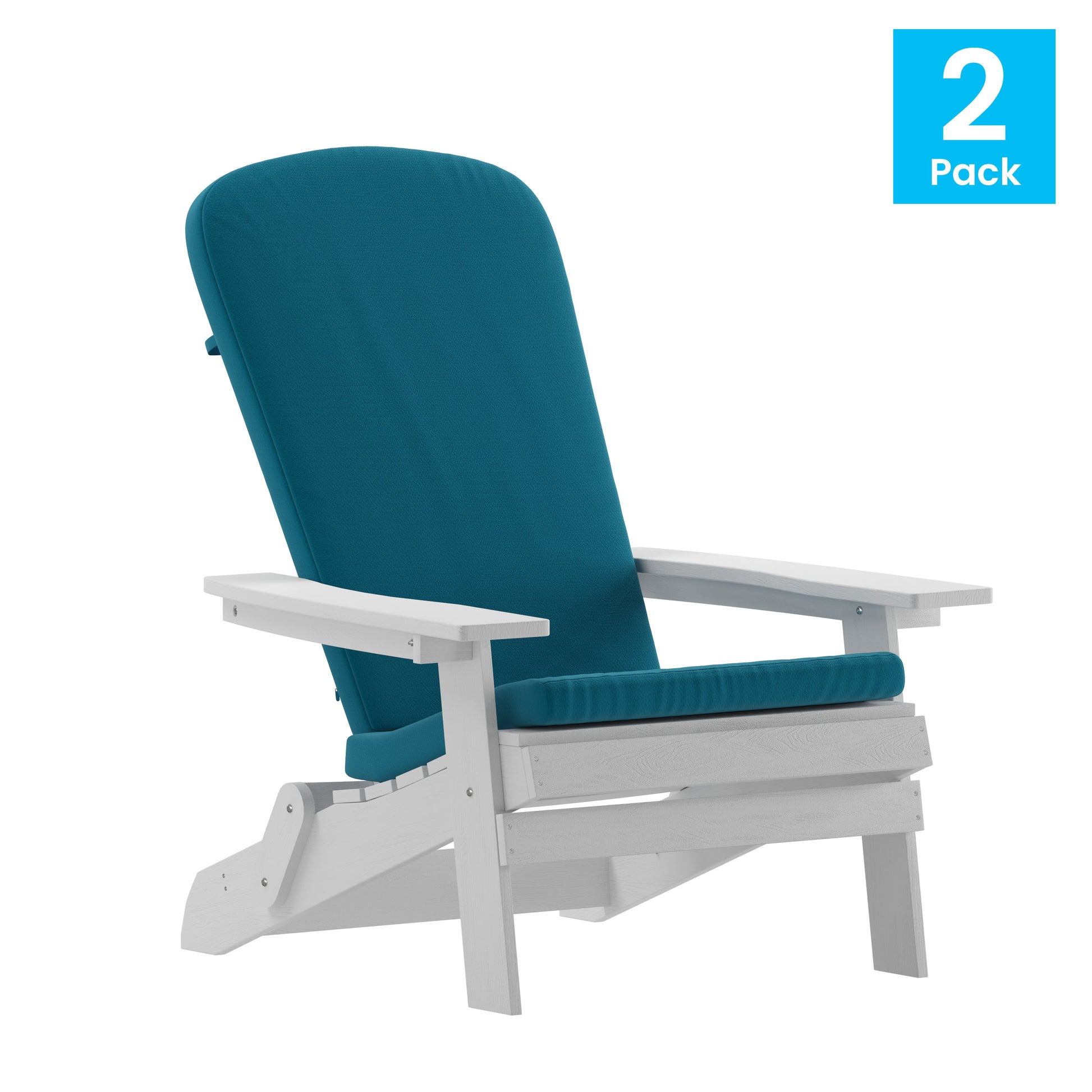 Charlestown Set of 2 All-Weather Poly Resin Indoor/Outdoor Folding Adirondack Chairs in White with Teal Cushions for Deck, Porch, and Patio Dimensions: 30.25"W x 34"D x 37"H
