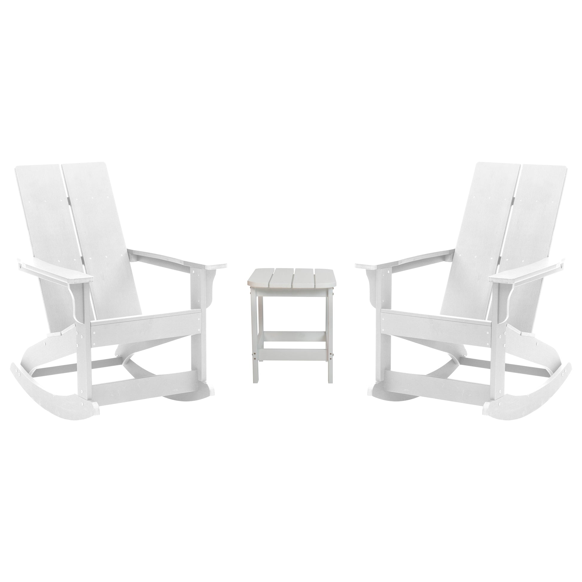 Set of 2 White Finn Modern Commercial Grade All-Weather 2-Slat Poly Resin Rocking Adirondack Chairs with Matching Side Table Dimensions: 29"W x 38"D x 40.5"H