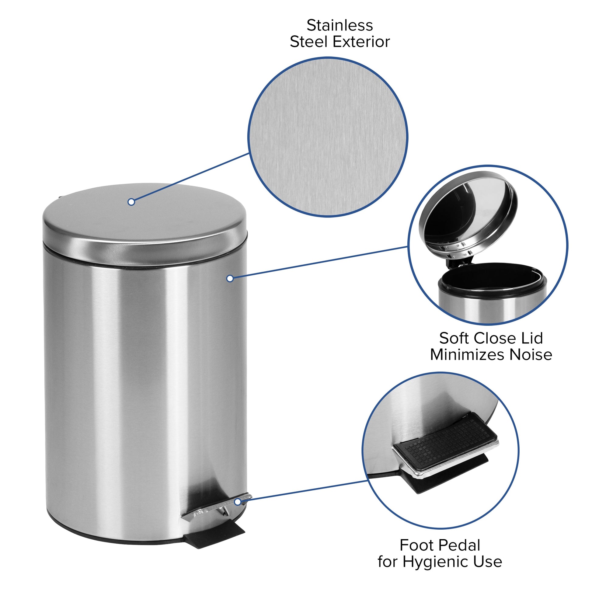 Round Stainless Steel Imprint Resistant Soft Close, Step Trash Can -3.2 Gallons (12L) Dimensions: 10"W x 12"D x 15.5"H