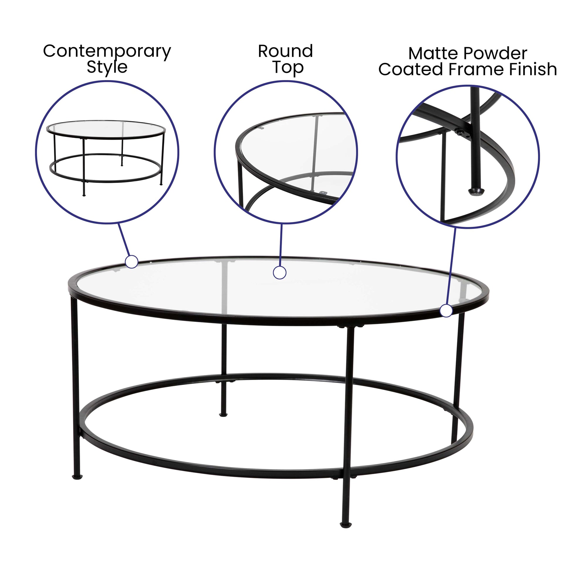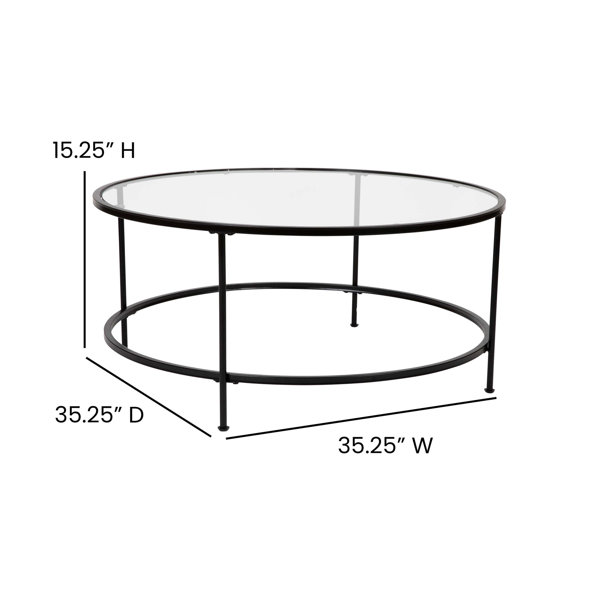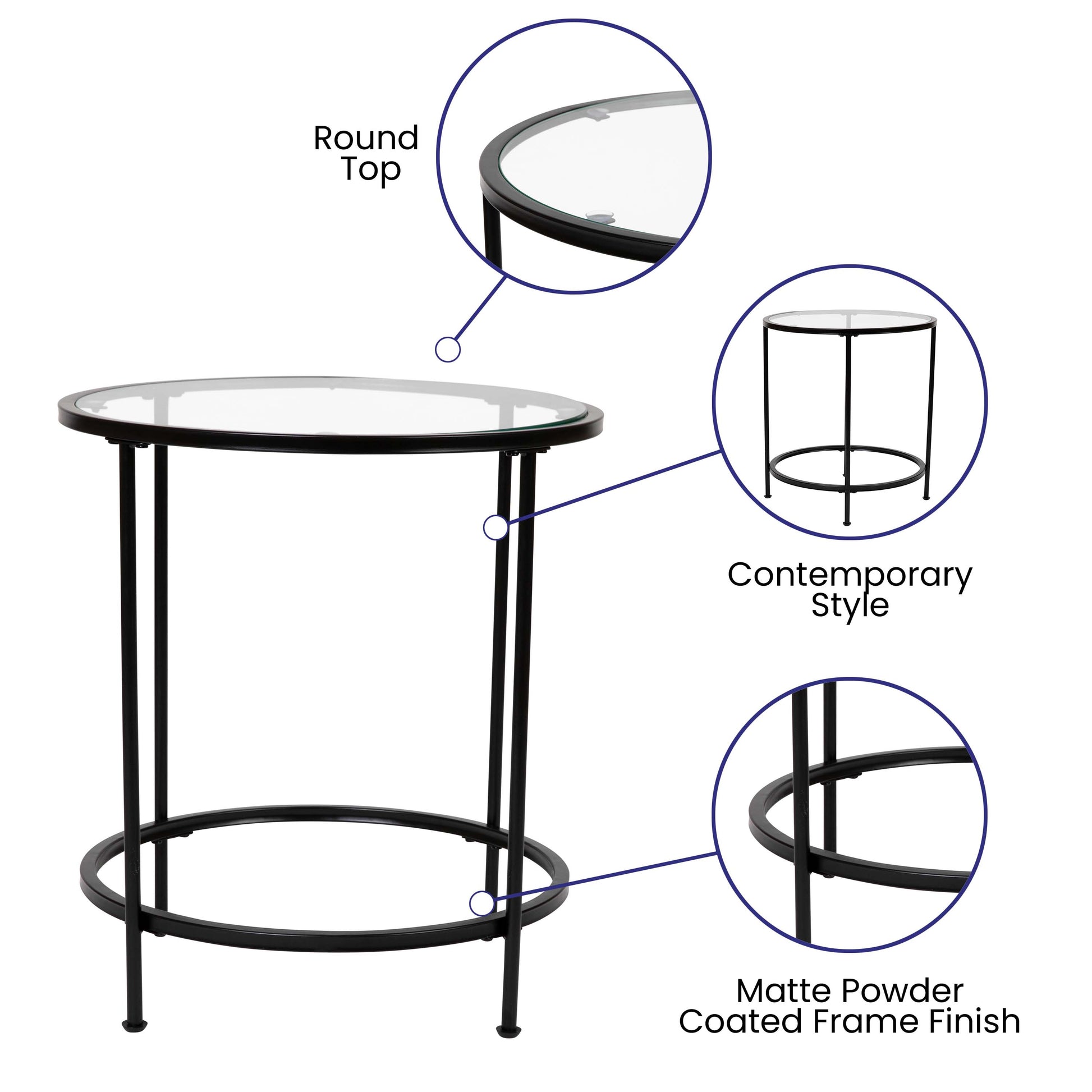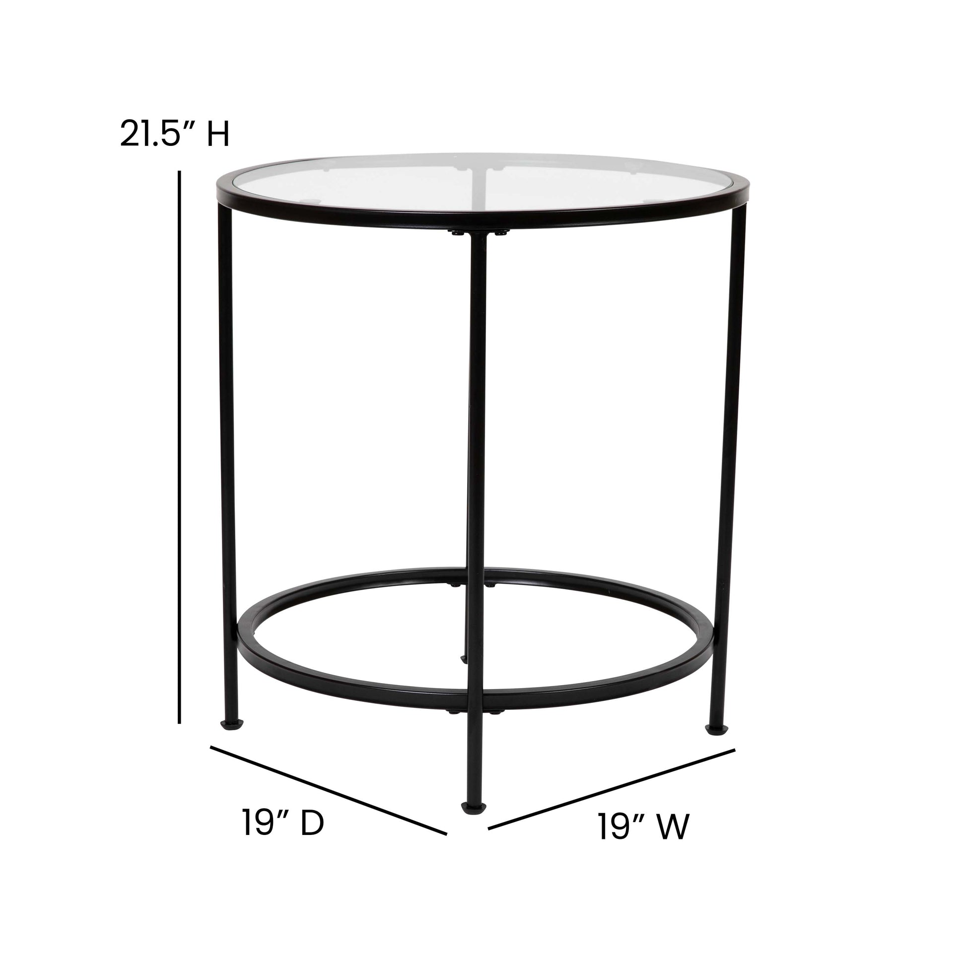 Astoria Collection Coffee and End Table Set - Clear Glass Top with Round Matte Black Frame - 3 Piece Occasional Table Set Dimensions: 19.5" - 35.25"W x 19.5" - 35.25"D x 15.25" - 21.5"H