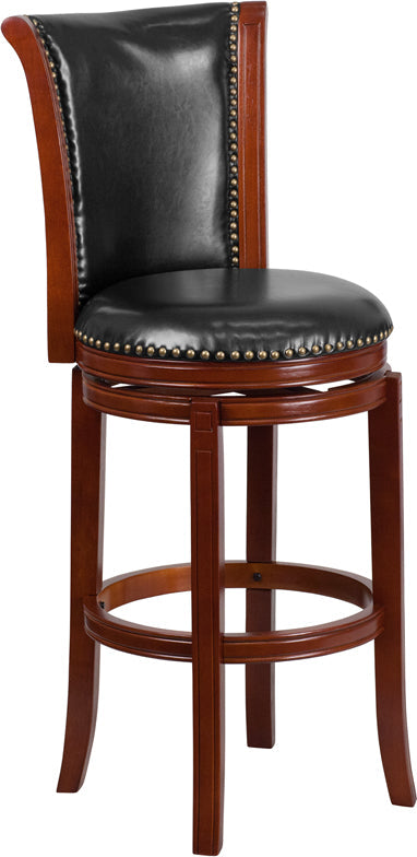 Vestina 30'' High Dark Chestnut Wood Barstool with Panel Back and Black LeatherSoft Swivel Seat Dimensions: 21"W x 22"D x 45.75"H
