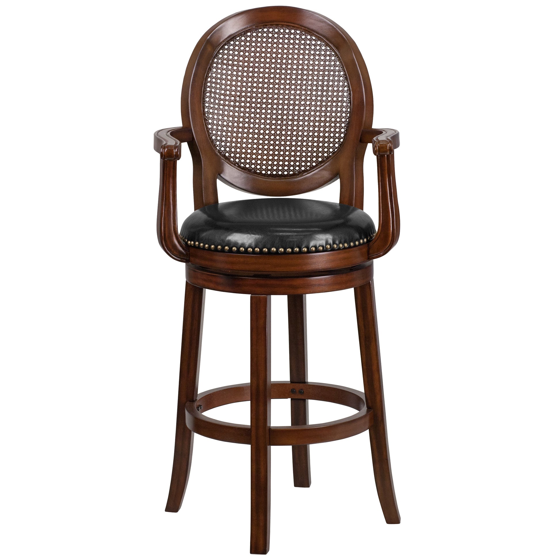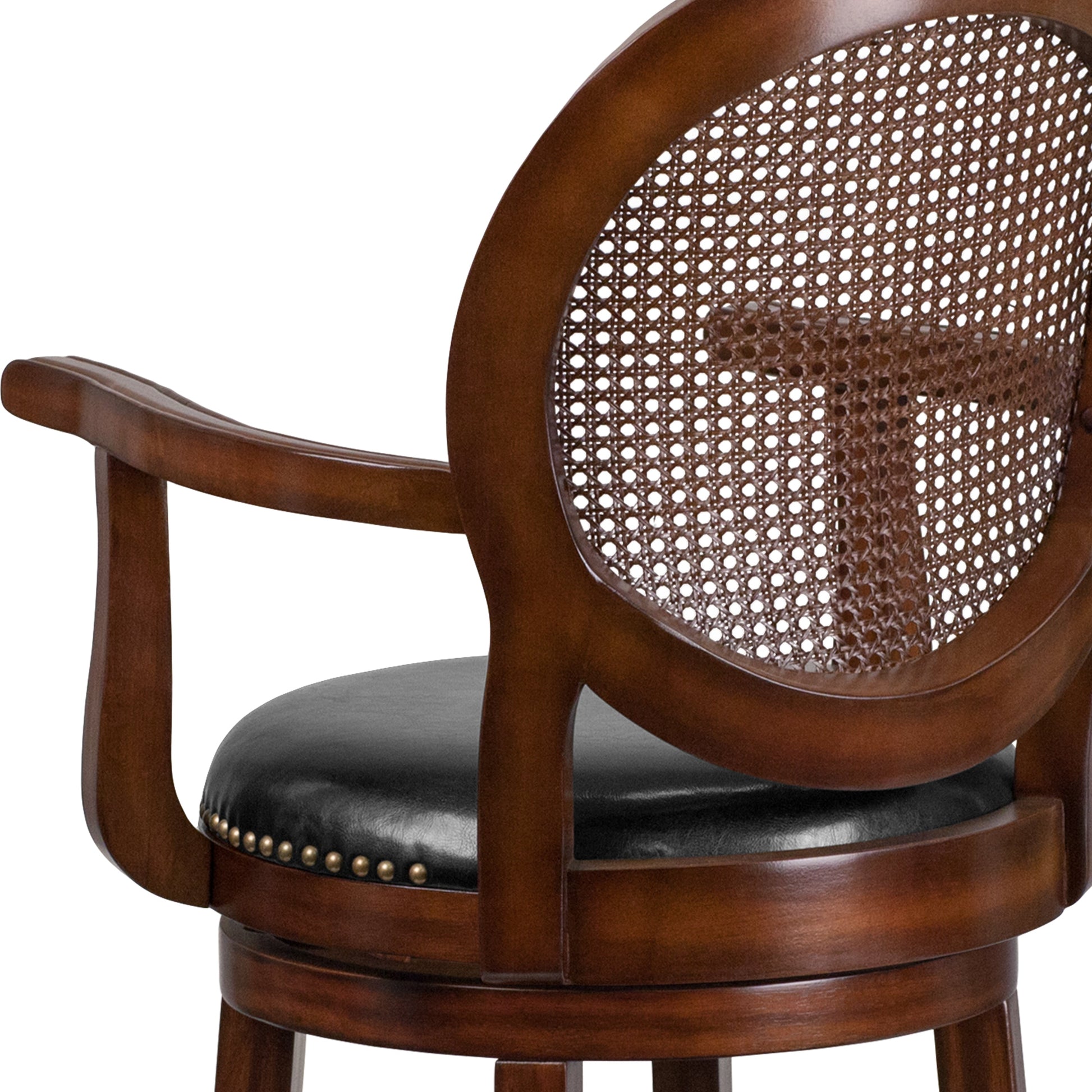 Victor 30'' High Expresso Wood Barstool with Arms, Woven Rattan Back and Black LeatherSoft Swivel Seat Dimensions: 22.75"W x 23.5"D x 48.25"H