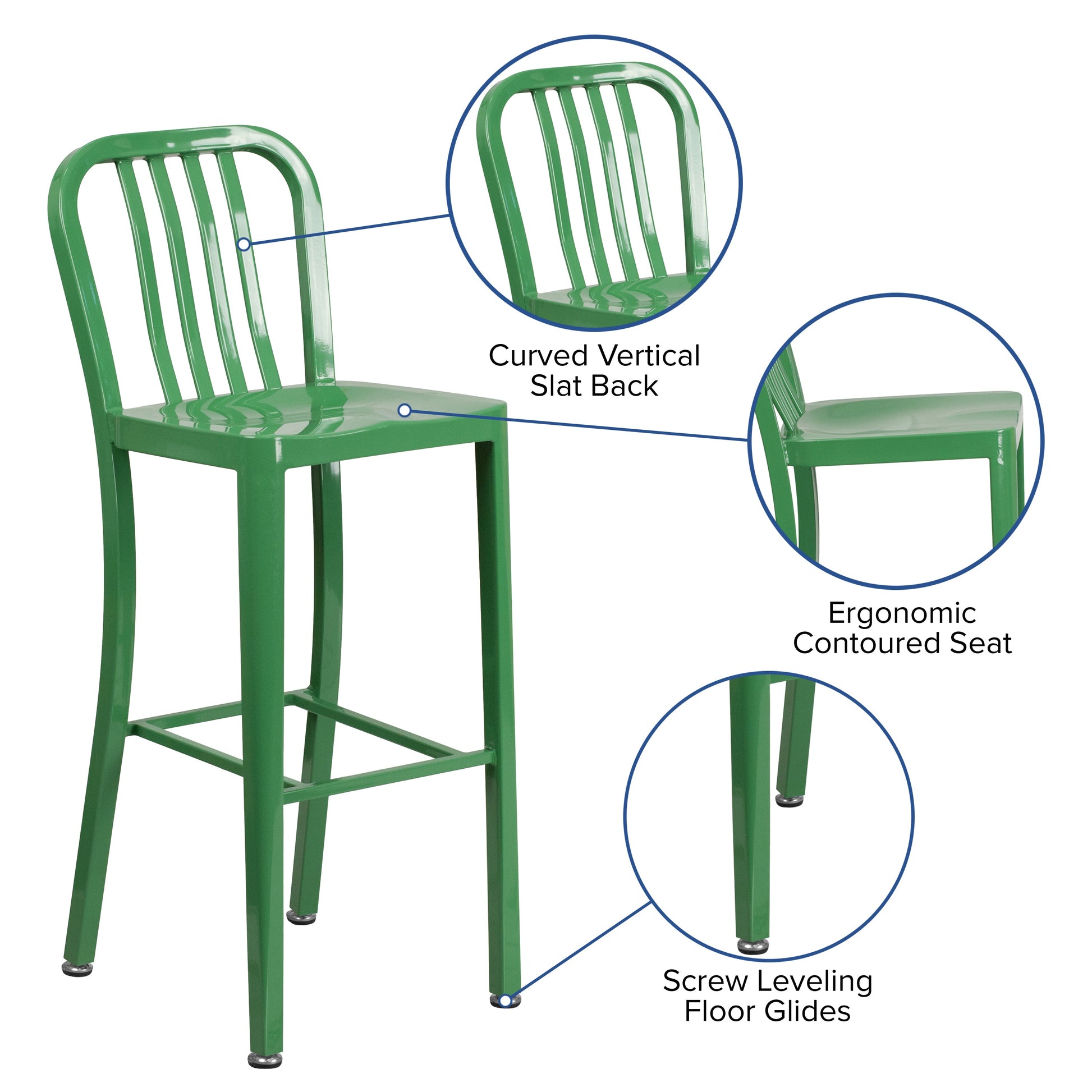 Gael Commercial Grade 30" High Green Metal Indoor-Outdoor Barstool with Vertical Slat Back Dimensions: 15.5"W x 20"D x 43"H
