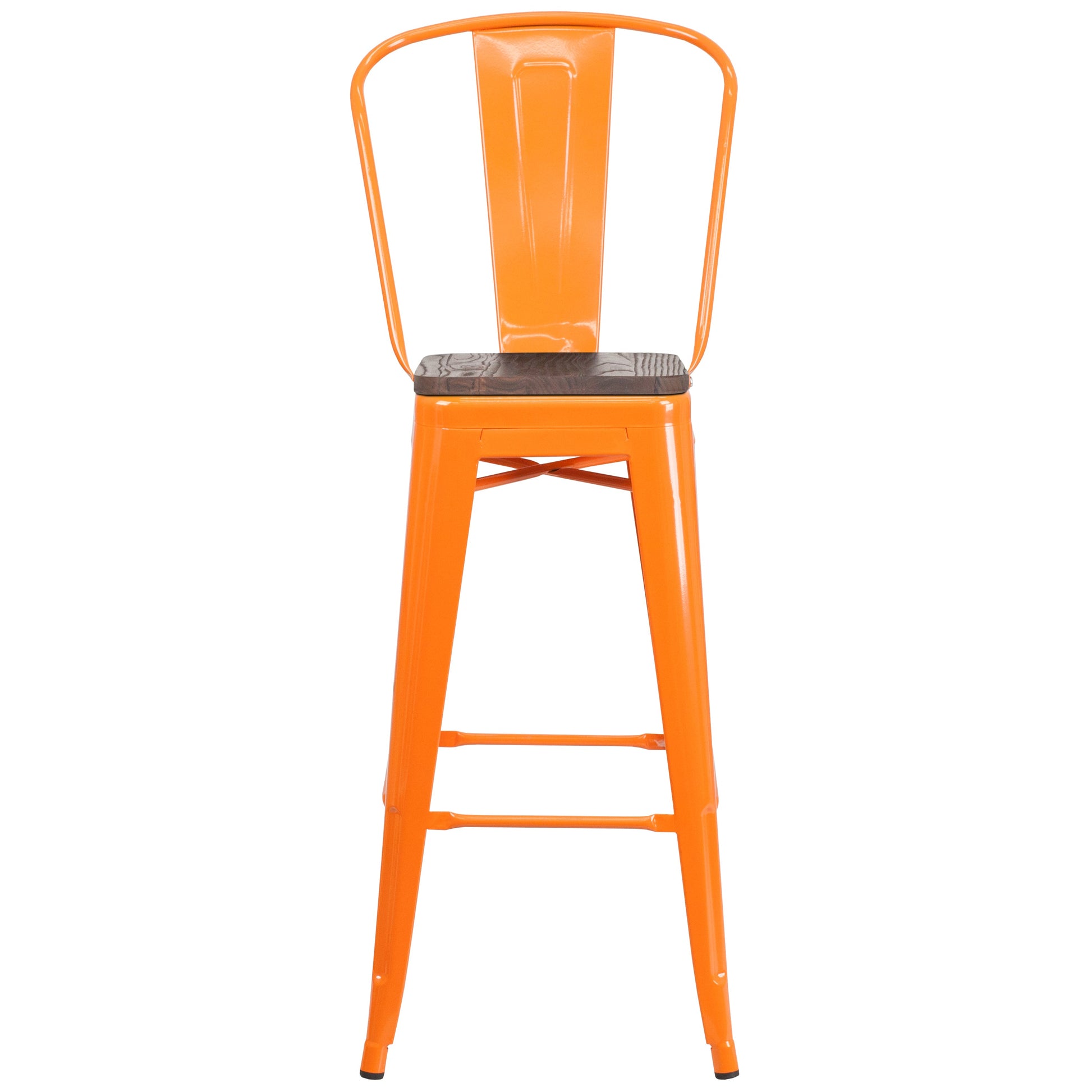 Lily 30" High Orange Metal Barstool with Back and Wood Seat Dimensions: 17.75"W x 20"D x 45.25"H