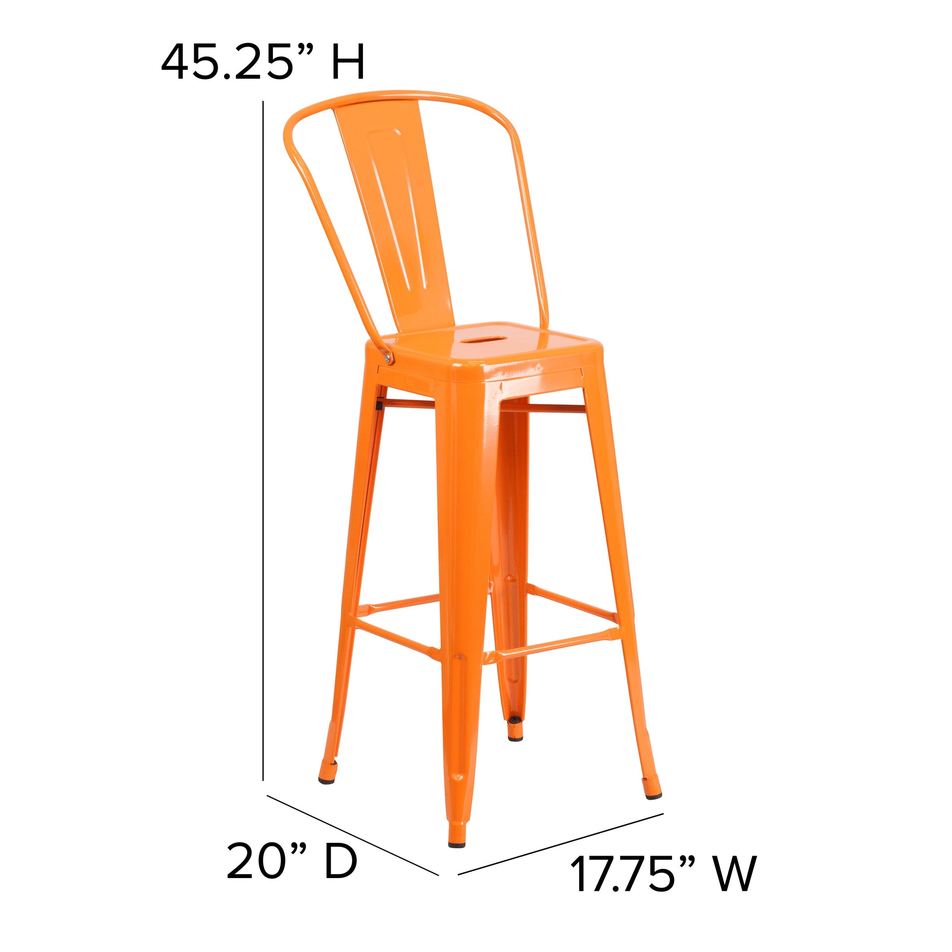 Kai Commercial Grade 30" High Orange Metal Indoor-Outdoor Barstool with Removable Back Dimensions: 17.75"W x 20"D x 45.25"H