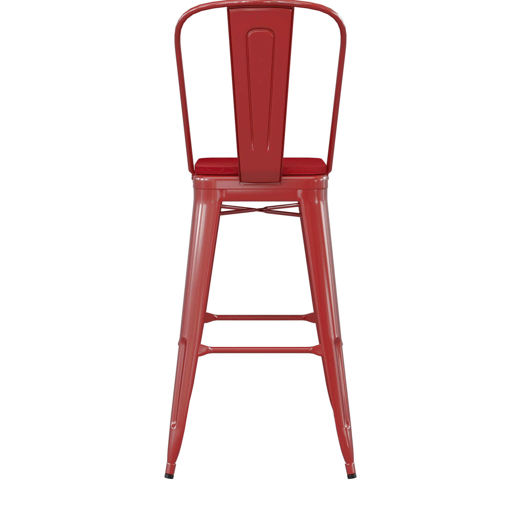 Kai Commercial Grade 30" High Red Metal Indoor-Outdoor Bar Height Stool with Removable Back and Red All-Weather Poly Resin Seat Dimensions: 17.75"W x 20"D x 45.25"H